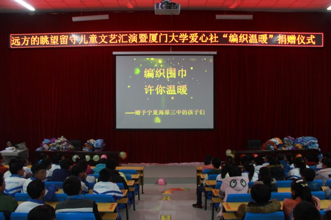 12月10日晚,厦门大学第十六届研究生支教团宁夏分队在海原三中报告厅举办 “远方的眺望”关爱留守儿童系列活动汇报演出暨厦门大学爱心社“编织温暖”捐赠仪式,队员们近两个月来的策划执行在这个晚上划上了圆满的句号。此次系列活动由分配在海原三中的两位支教队员刘倩和张瑶精心策划组织,其他队员同理配合执行,为期近两个月的系列活动以其丰富多样的形式、生动有趣的设计、温馨感人的内容先后吸引了两百余名留守儿童的积极参与,真正让留守的孩子们不再感到孤单并度过了一段温暖欢乐的时光。