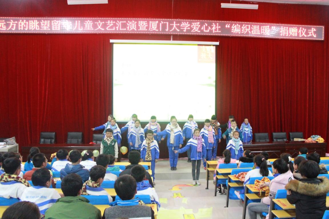 为了让留守儿童得到更多的关怀和爱护,支教队员积极寻求各方支持,厦门大学爱心社在了解到孩子们的需求后,立即发动全体社员参与“编织温暖”行动,他们自己买好织针和毛线,亲手织就了一百二十八条漂亮又保暖的围巾。在此次汇报演出的末尾,支教队员们举行了厦门大学爱心社“编织温暖”捐赠仪式,为现场每一位参与活动的留守儿童戴上一条御寒围巾,为这个冬天增添些许温暖。