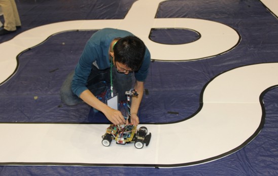 比赛开始前,选手们都在适应赛道上调试着自己的智能车,使爱车尽快地适应赛道。而同样忙碌的志愿者们,为了比赛可以如期进行,大早就来打扫清理场地及铺赛道。上午的比赛结束后每个大组各有8支参赛队进入下午举行的决赛。