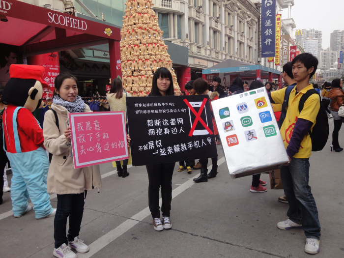 中午12时许,团队一行人到达终点站中山路,行为艺术“解救‘手机人’”吸引了不少目光,在参与者的努力下,12时08分手机人被成功解放!同时Free Hugs “爱的抱抱团”的活动也引得不少人纷纷上前合影。
