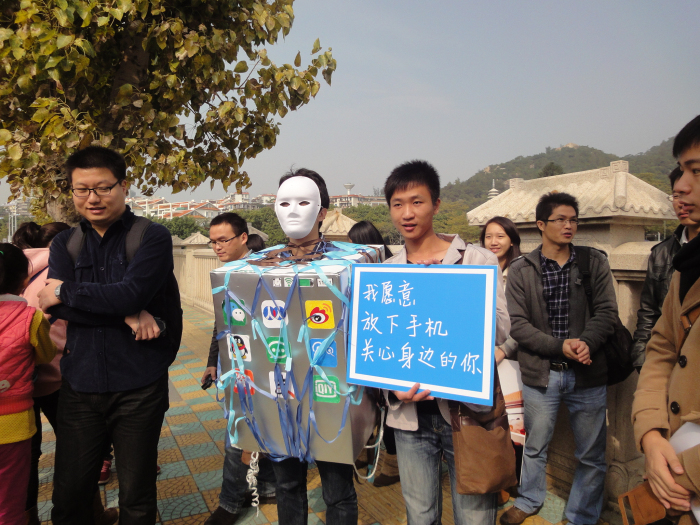 本次“爱的抱抱团”系列活动先是于12月12日在厦门大学三家村广场举办,包括行为艺术“解救‘手机人’”、KT版留言、阳光树洞、给陌生人拥抱以及录制短片等活动,吸引了广大师生与过路游客的参加,好评不断。作为系列活动之一,本次校外活动更以独特的活动意义和新颖的活动形式让更多人了解到:不要再当个“低头族”,应多多关心身边的人和事,温暖不间断。更吸引了厦门电视台进行跟踪报道。