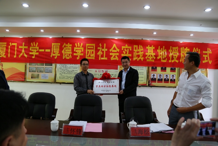 11月13日,“厦门大学—厚德学园学生社会实践基地”授揭牌仪式在厚德学园举行。厦门大学团委书记陈怀锋、生命科学学院党委副书记张伟、翔安校区团工委书记洪海松、石井镇党委委员许小军、生命科学学院团委副书记毛毛、辅导员陈运动,厚德学园部分师生代表及厦门大学学生志愿者代表出席了授揭牌仪式。陈怀锋代表学校团委授予厚德学园“厦门大学—厚德学园学生社会实践基地”牌匾,并与厚德中学校长李志红共同揭牌。南安厚德学园作为厦门大学社会实践基地,将与厦门大学建立长期合作关系,指导学生开展丰富多彩的教学互助合作活动。