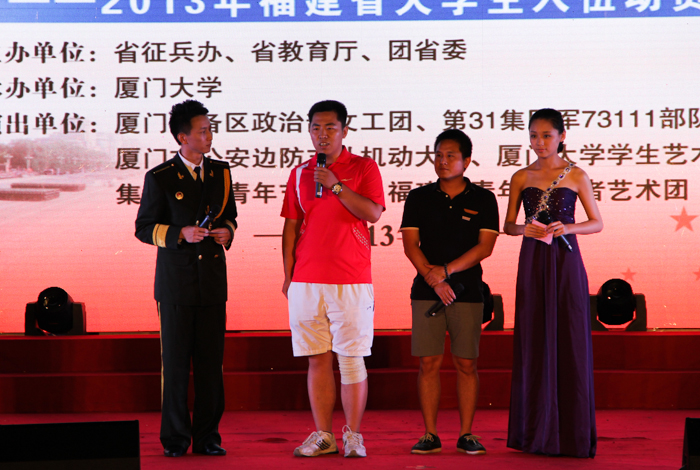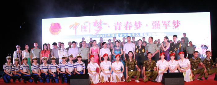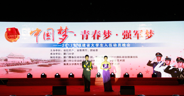 7月25日晚7点30分,由省征兵办、省教育厅、团省委主办,厦门大学承办的2013年福建省大学生入伍动员晚会在厦门大学芙蓉湖畔拉开大幕。来自厦门警备区政治部文工团、第31集团军73111部队政治部演出队、厦门市公安边防支队机动大队、厦门大学学生艺术团、集美大学学生艺术团的士兵和同学为现场观众带来了一场洋溢着蓬勃朝气的精彩演出,展现了军旅生活的方方面面,传递了“当兵光荣”的向上思想,号召广大青年积极响应征兵。厦门大学党委副书记、纪委书记赖虹凯等领导出席了此次晚会。