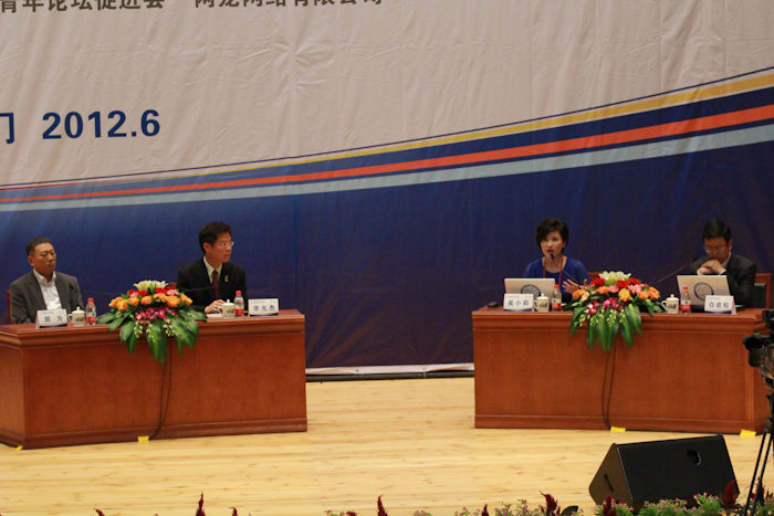 李允杰教授作为第二个上台演讲嘉宾,“我喜欢近距离的交流”,他手执移动话筒,走到前台,开始了热情洋溢的演讲。他从历史人物谈起,用林觉民、秋瑾等革命人物的人格魅力来说明,青年人应从历史中汲取力量,互为热情地推动两岸青年的文化交流;方文山和周杰伦的“中西合璧”来解读创意的伟力,“每个年轻人心中都有创意,关键是怎样激发”;在热情和创意的前提下,态度则决定能否将最初的想法成功的实践。“青年的创意需要有政府、NGO以及民间企业三方合作来共同推动、帮助”,他向大家展示了一系列协助青年就业接轨方案,并提出“两岸应该促进青年的交流,使他们优势互补,更好地发展。”