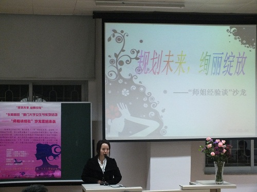 3月6日晚7点,于公共事务学院举办的“师姐谈经验交流沙龙中” 中,09级社会学系硕士徐爱平,09级公共管理系硕士姜鱈桐以及10级公共管理系博士张颖伦三位优秀女研究生与在座的观众零距离分享成长心路,展现她们独特的青春风采,为现场女生送去人生的启迪。