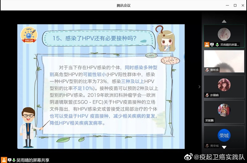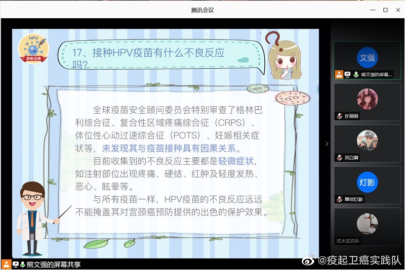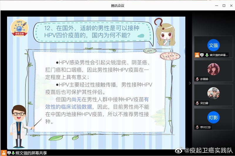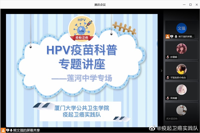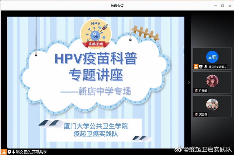为进一步普及HPV相关知识,扩大国产HPV疫苗影响力。8月1日-2日,厦门大学公共卫生学院“疫起卫癌”实践队在苏迎盈老师和赵煜老师的指导下,通过腾讯会议,面向厦门莲河小学、内厝中学、莲河中学、新店中学的师生家长等,开展了线上HPV疫苗专题科普讲座。公卫学子将所学专业知识送进中小学课堂,为师生家长进行健康科普,呼吁大家关注自身健康,重视健康生活理念。