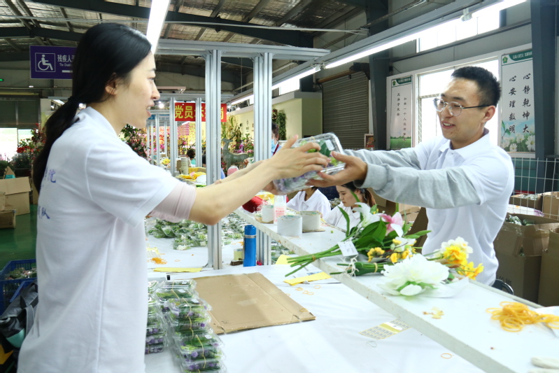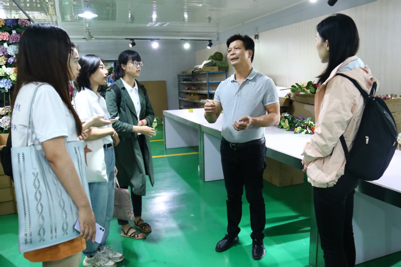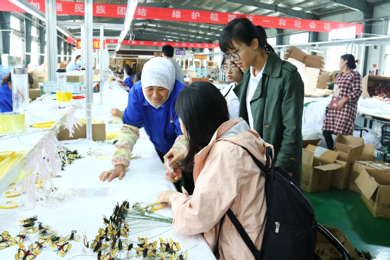 随后,实践队继续前往宁夏隆德人造花工艺有限公司体验学习。宁夏隆德人造花工艺有限公司2013年通过招商引资来到隆德,目前已是闽宁协作企业的示范窗口和西北最大的残疾人就业基地。在潘胜贤经理的带领下,队员们领略了千余种样式美观、栩栩如生的人造花样品,并亲眼见证了人造花在工人们的巧手中从零件绽放为“鲜花”。慨叹之余,实践队员们也纷纷向企业职工请教了人造花制作方法,并与工人们一同劳动。组装花束、粘贴标签、投送分类,队员们热情高涨,工作高质高效,得到了工厂职工的一致好评。在流水线作业中,队员们深刻认识到团结协作的重要性,也更加坚定地体会到“劳动创造美好生活,劳动不分贵贱”。广大劳动者在平凡的岗位中展现自身价值,为脱贫攻坚贡献着自己的一份力量。
