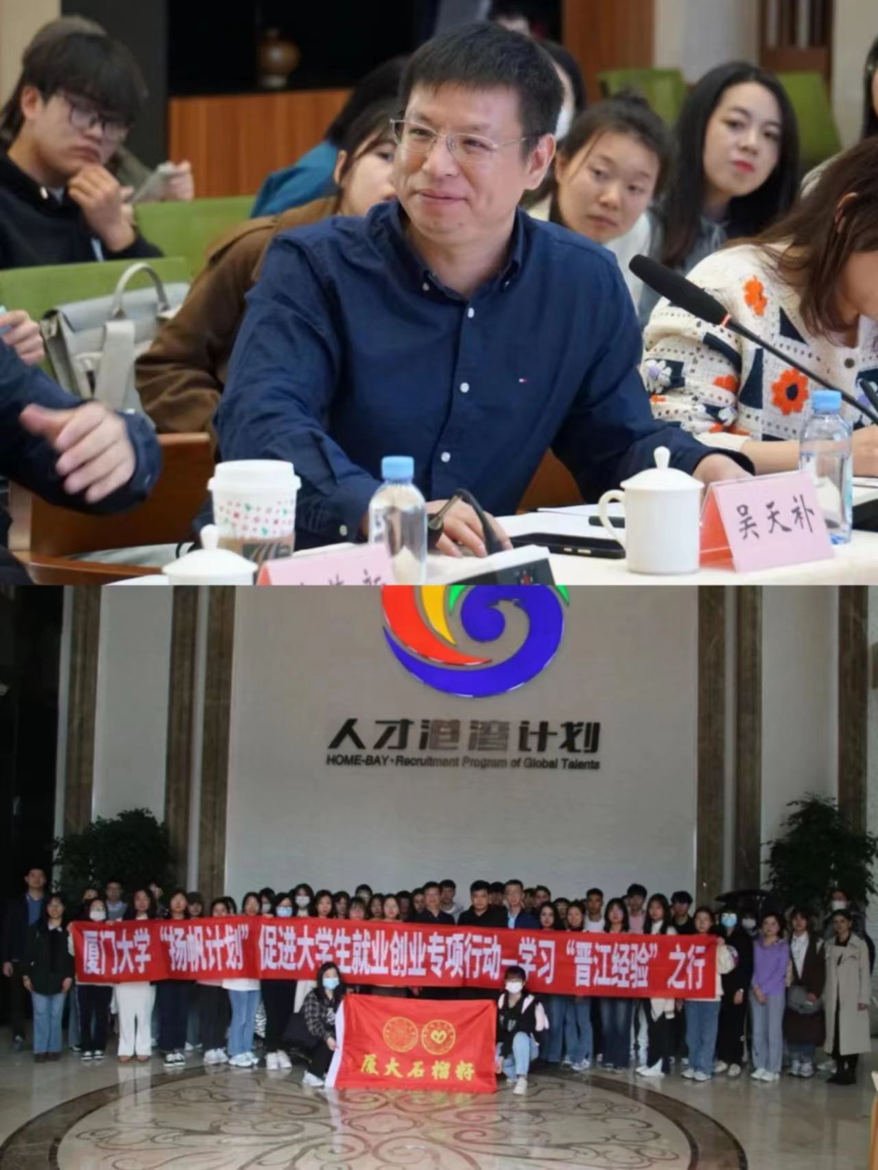 最后,吴天补进行总结发言。他提到了晋江市委开展的三个“首创”,即首创全国地区性大学生联合会,首创大学生进机关企事业单位实习活动,首创大学生进机关企事业单位实习活动。同时,他也表达了对厦大学子来晋江实习与工作的热烈欢迎,希望更多的厦大学子将青春的热血挥洒在这片“爱拼敢赢”的土地上。