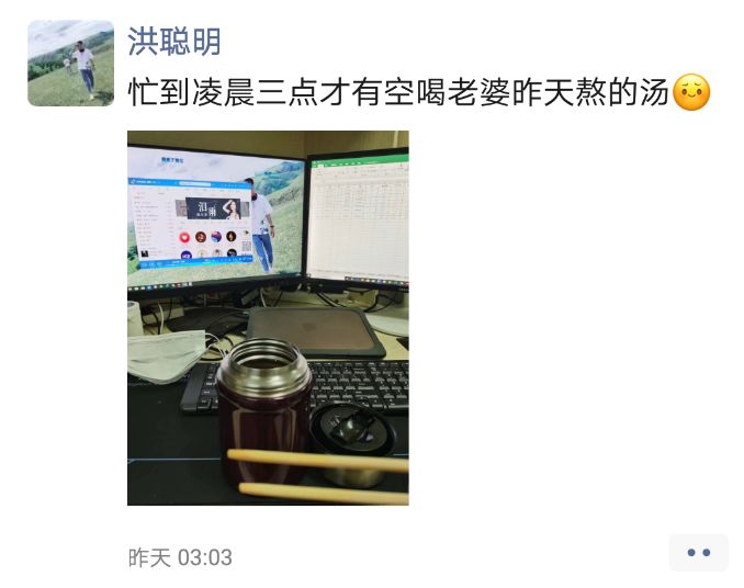 心疼一天只吃一顿饭的洪聪明,他的妻子特意为他煲了汤。而这“爱心汤”的结局往往只有两种:要么变凉时才被享用;要么因为太忙,根本没时间打开餐盒的盖子,最后也只好倒掉,重新再做一份。对此,他的妻子既无奈又理解,她说道:“心疼肯定是会有的,但是,在这个非常时期,能贡献自己一份力量也是应该的。我能做的,就是支持他,在生活上,用自己的方式去照顾他。”