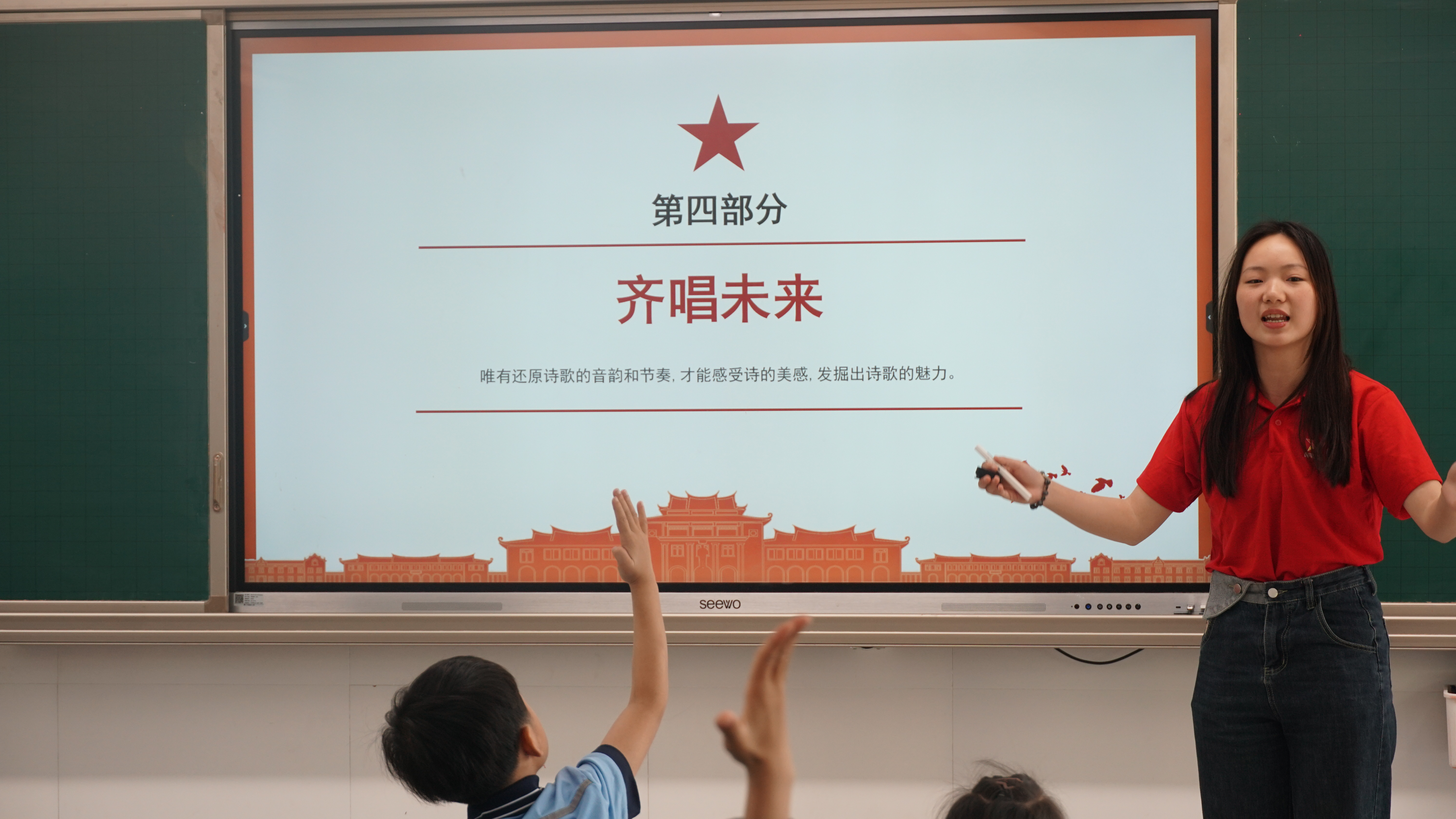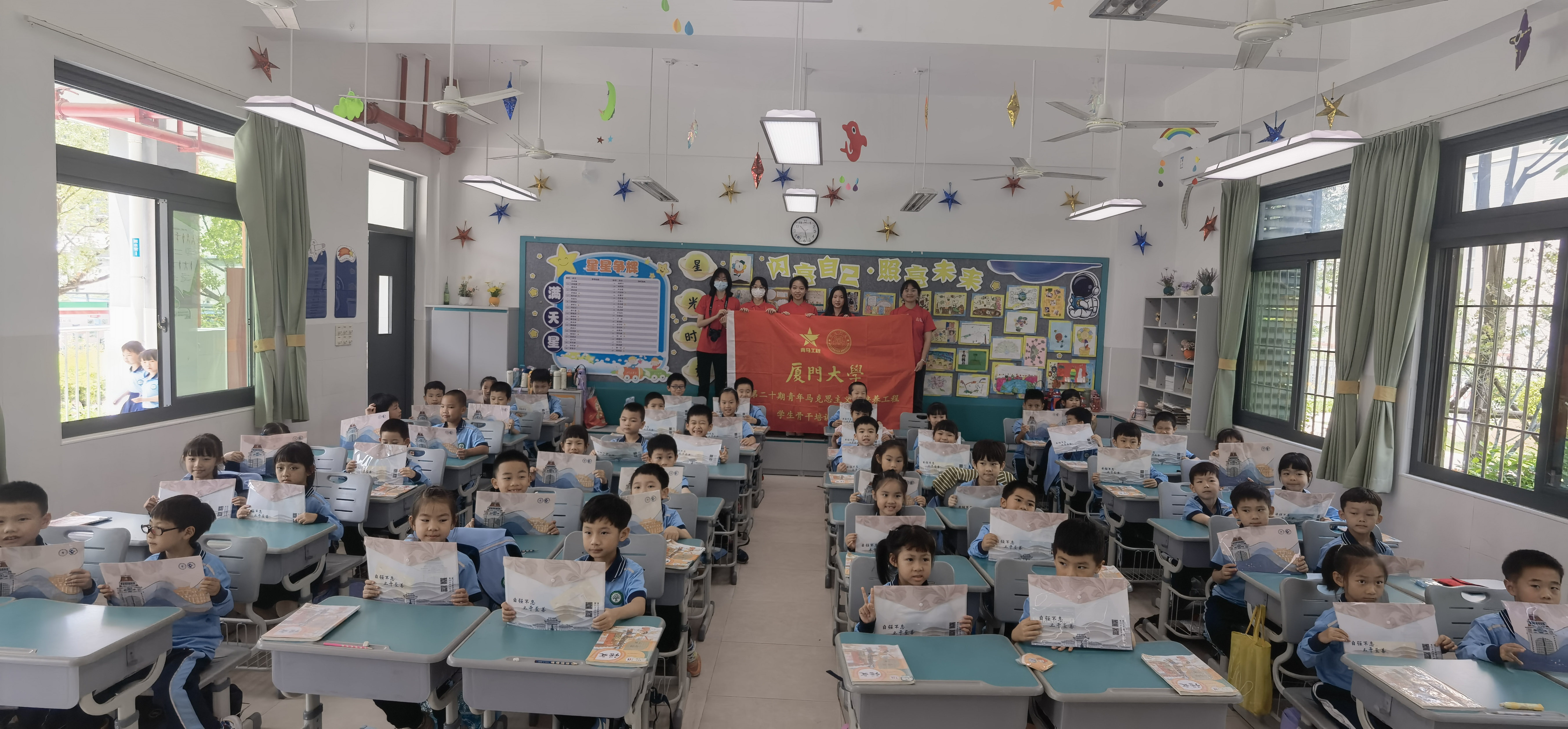 5月15日上午,一声声清脆悦耳的朗诵声,一阵阵响亮热烈的掌声不时从厦门市深田小学一年(2)班传出。厦门大学第二十期“青马工程”学生骨干培训班(以下简称“青马班”)第三组学员走进深田小学,为一年级小朋友上了一堂创意诗词赏析课,带领同学们追寻先贤历史足迹,聆听先辈革命故事,感受毛主席经典词作《沁园春·雪》的磅礴气势,激发他们努力学习、报效祖国的决心和志向。