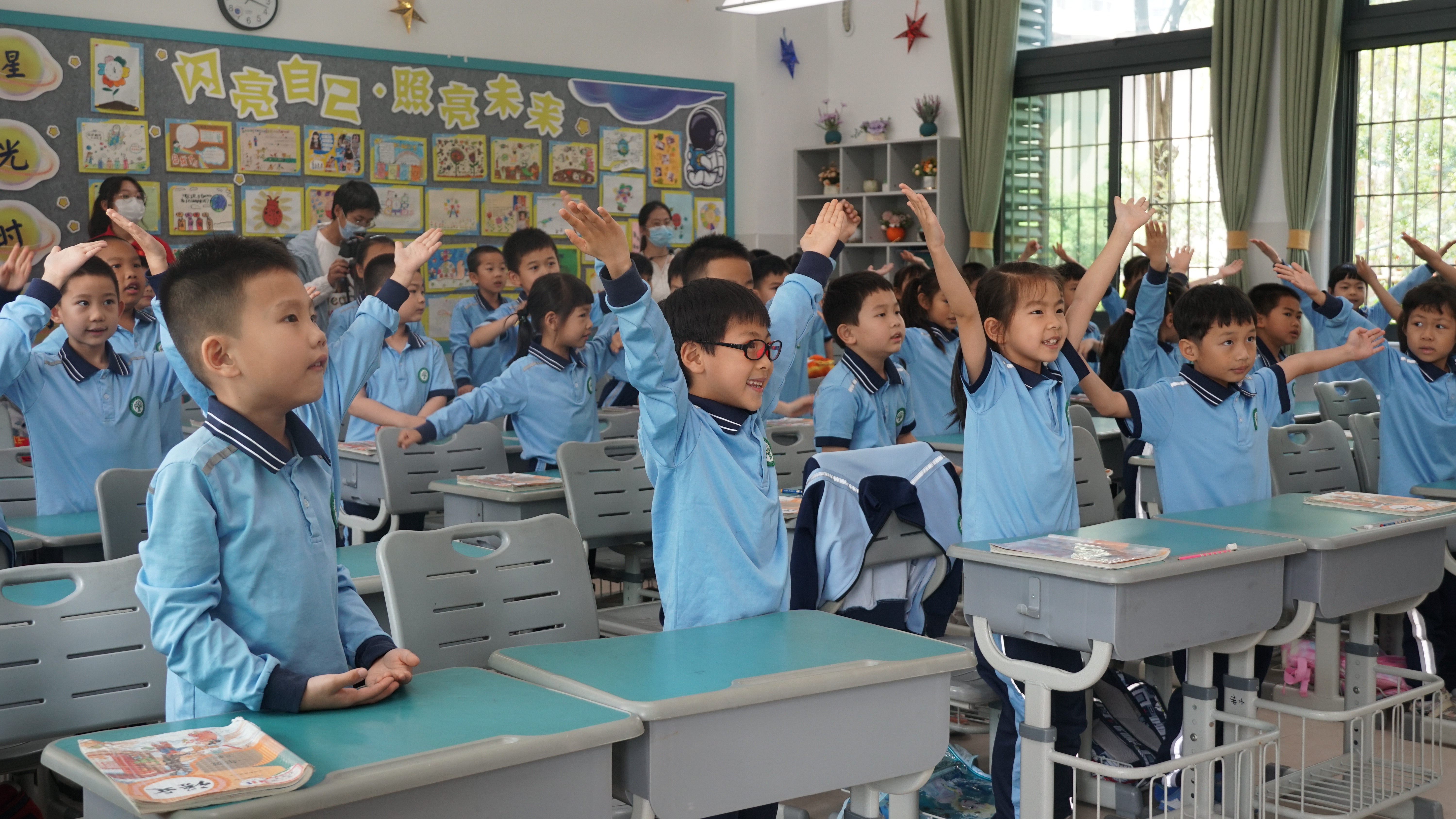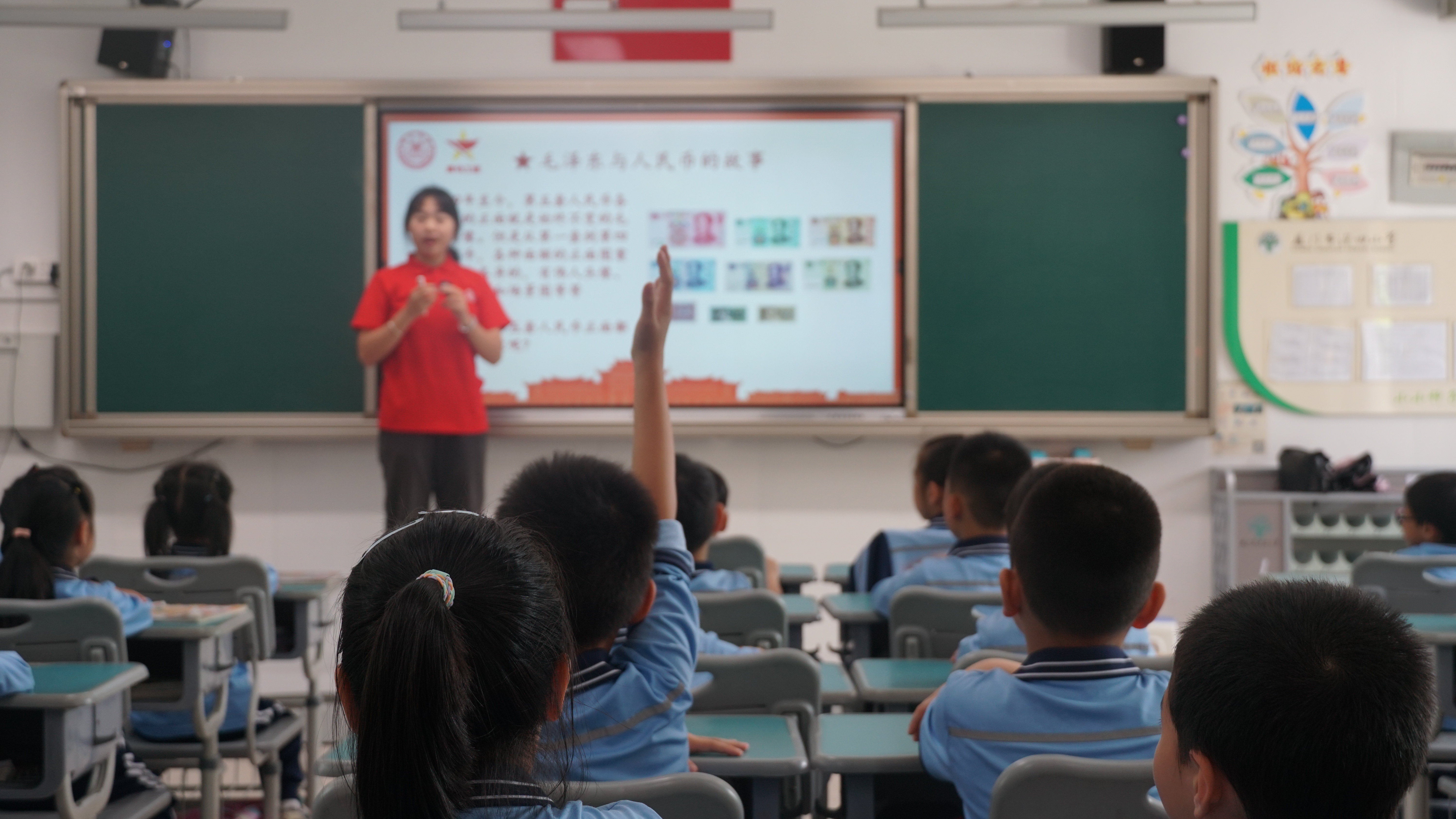“新中国是1949年成立的”“党旗上的镰刀代表着农民,锤子代表着工人”“中国的3艘航空母舰分别叫辽宁舰、山东舰、福建舰”……同学们个个积极踊跃、热情高涨,俨然将问答环节变成了“抢答”现场。