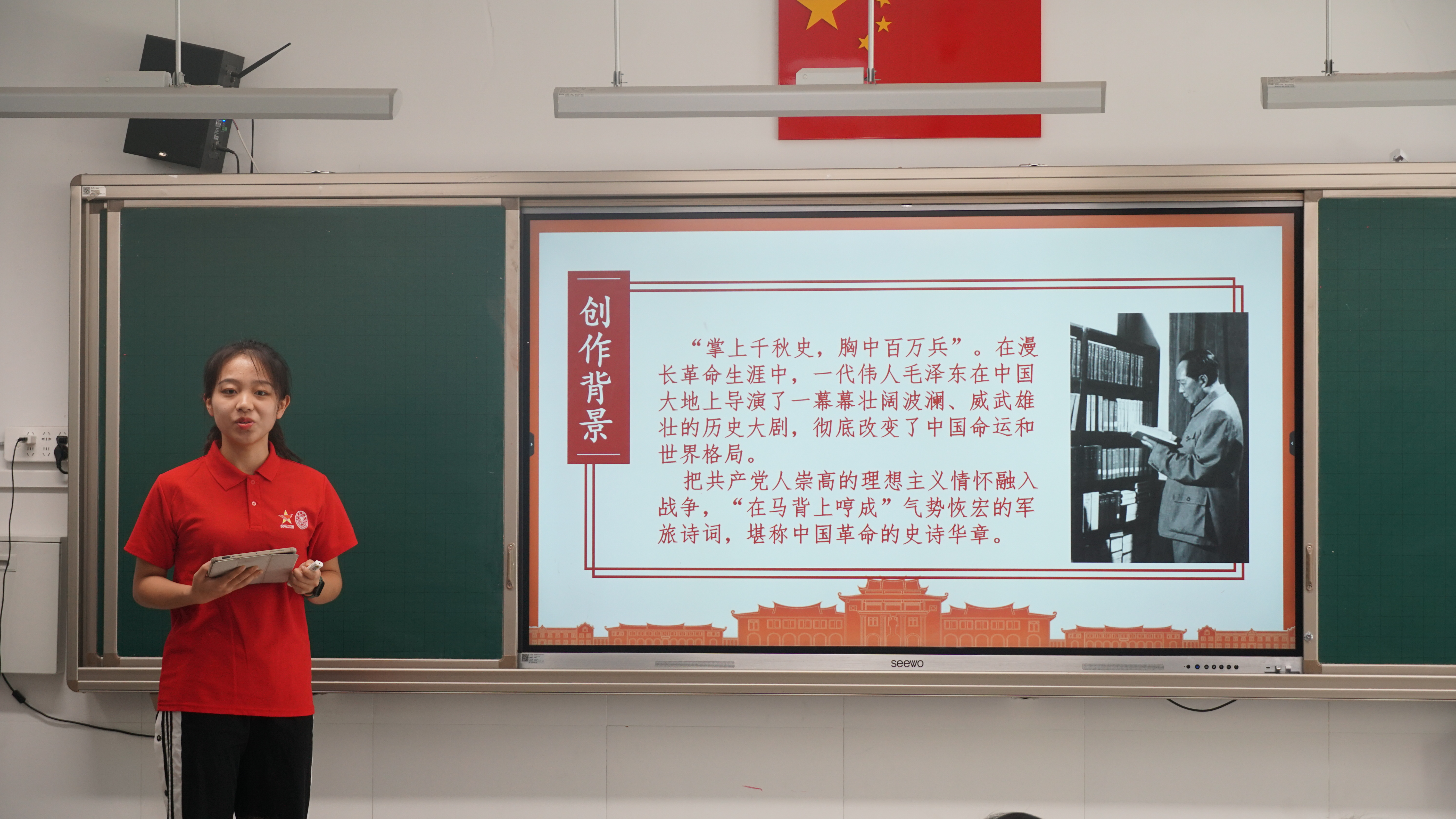 课程伊始,学员李璐琦用一张厦门大学校主陈嘉庚先生与毛主席在延安的合影引出了《沁园春·雪》词作者——毛主席的生平。她从家庭、求学、革命等几个关键节点入手,并结合大量历史图片、影像、一年级课文《吃水不忘挖井人》等,向同学们介绍了毛主席波澜壮阔的一生。孩子们个个双臂叠放、腰板挺直、昂首挺胸、全神贯注,仿佛也跟着毛主席的一个个经典时刻,走进了遥远的红色年代。