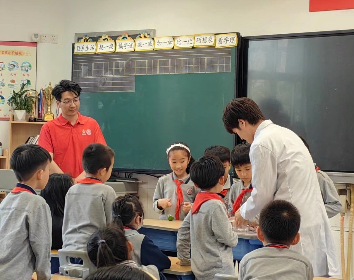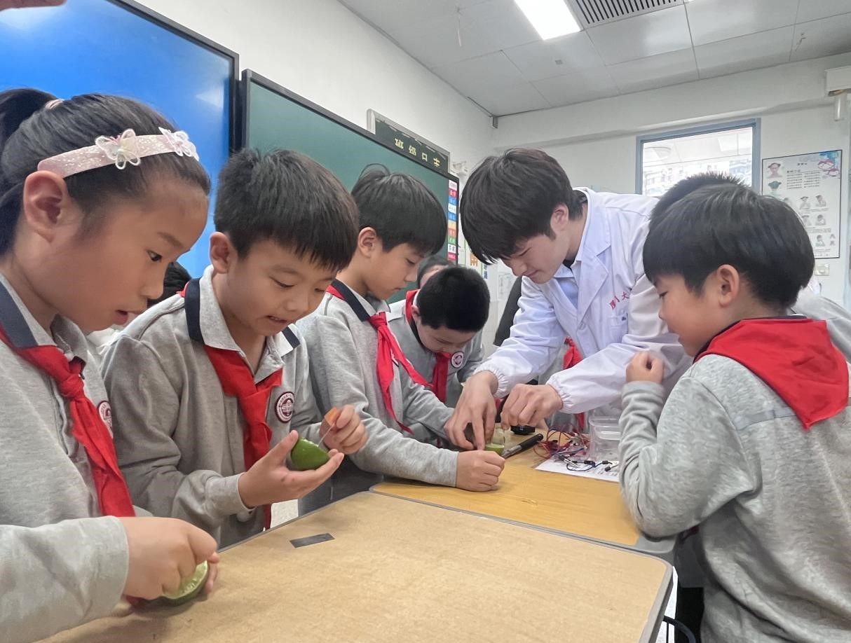 党的二十大报告中指出,实施科教兴国战略,强化现代化建设人才支撑。为进一步引导少年儿童将爱党爱国情怀转化为科技报国、科技强国的实际行动,从现在做起,不断提高科学文化素养,第六小组学员结合专业背景,在本次宣讲中设置了化学和物理科普环节。李嘉辉、陈柏逸、高林烁等通过“鲁米诺显色实验”和“水果发电实验”,帮助同学们从生活中的小实验里感受科学的魅力,激发同学们对科学探索的好奇与兴趣。