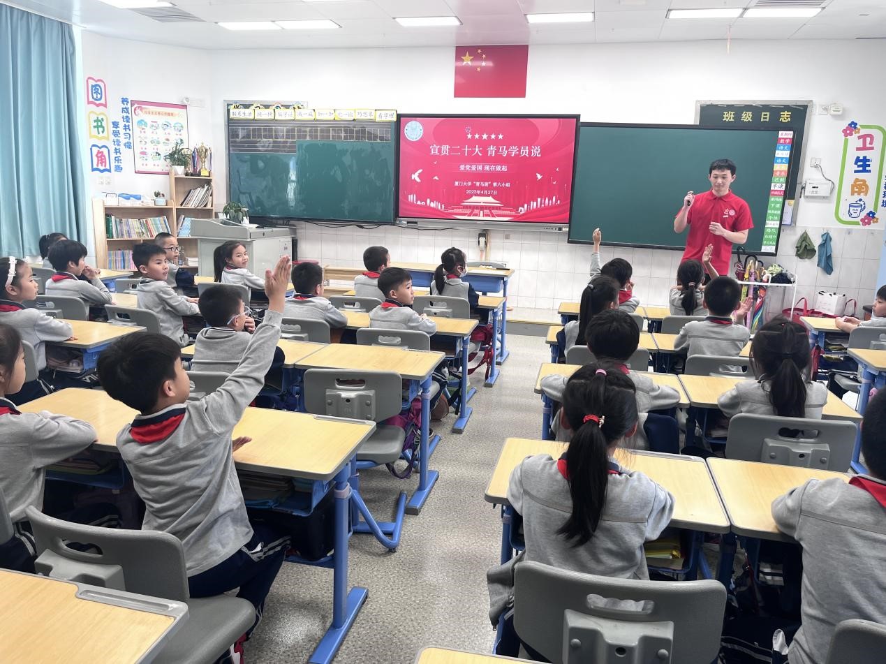 “我知道我知道!这是袁隆平爷爷!”4月27日下午,福建省厦门实验小学二年级10班的课堂上充溢着热情与活力。在厦门大学团委、福建省厦门实验小学的指导支持下,经过精心策划与周密筹备,厦门大学第二十期“青马工程”学生骨干培训班(以下简称“青马班”)第六组学员走进实验小学开展“爱党爱国 现在做起”主题宣讲活动,带领少年儿童共同学习党的二十大精神。本次宣讲活动由青马班指导老师、组织部/党的建设工作办公室张振涛等带队,学员曾庄葆、李嘉辉、陈柏逸、高林烁等主讲。