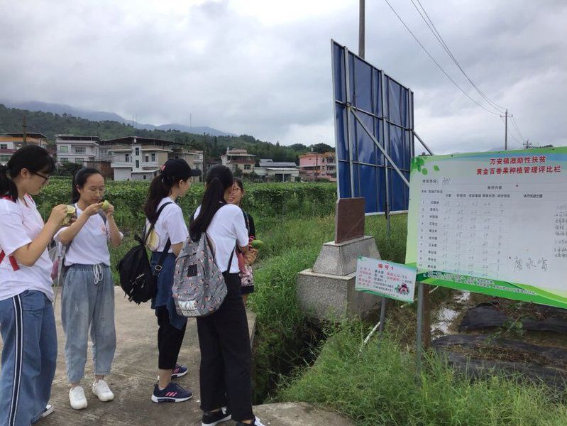7月14日上午10时,实践队结束对爱星农业的考察,前往城厢镇激励性扶贫项目东岗区黄金百香果种植基地,了解精准扶贫政策下,该基地的百香果产业发展状况,并从政府相关工作人员处获得了武平县发展详细材料。据李主任介绍,为帮助贫困种植户借助种植百香果脱贫,政府免费提供土地、果苗、技术、销售途径与宣传广告。目前种植区内百香果长势良好,贫困果农丰收有望。同时,实践队还了解了城厢镇农民致贫几类主要原因,发展百香果扶贫产业前的扶贫状况,发展百香果扶贫产业后的农户收入、住宅、家中设施状况,深感城厢政府积极落实党、上级政府的号召和政策,为扶贫作出巨大努力。