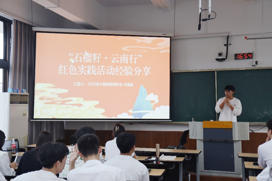 “石榴籽”学生骨干培训班代表马瑞涵同学从实践的规划路线讲到石榴籽在云南实践的趣事,以其在云南的实践经历向我们展示了一幅以躬身力行促进民族团结的壮美画卷。