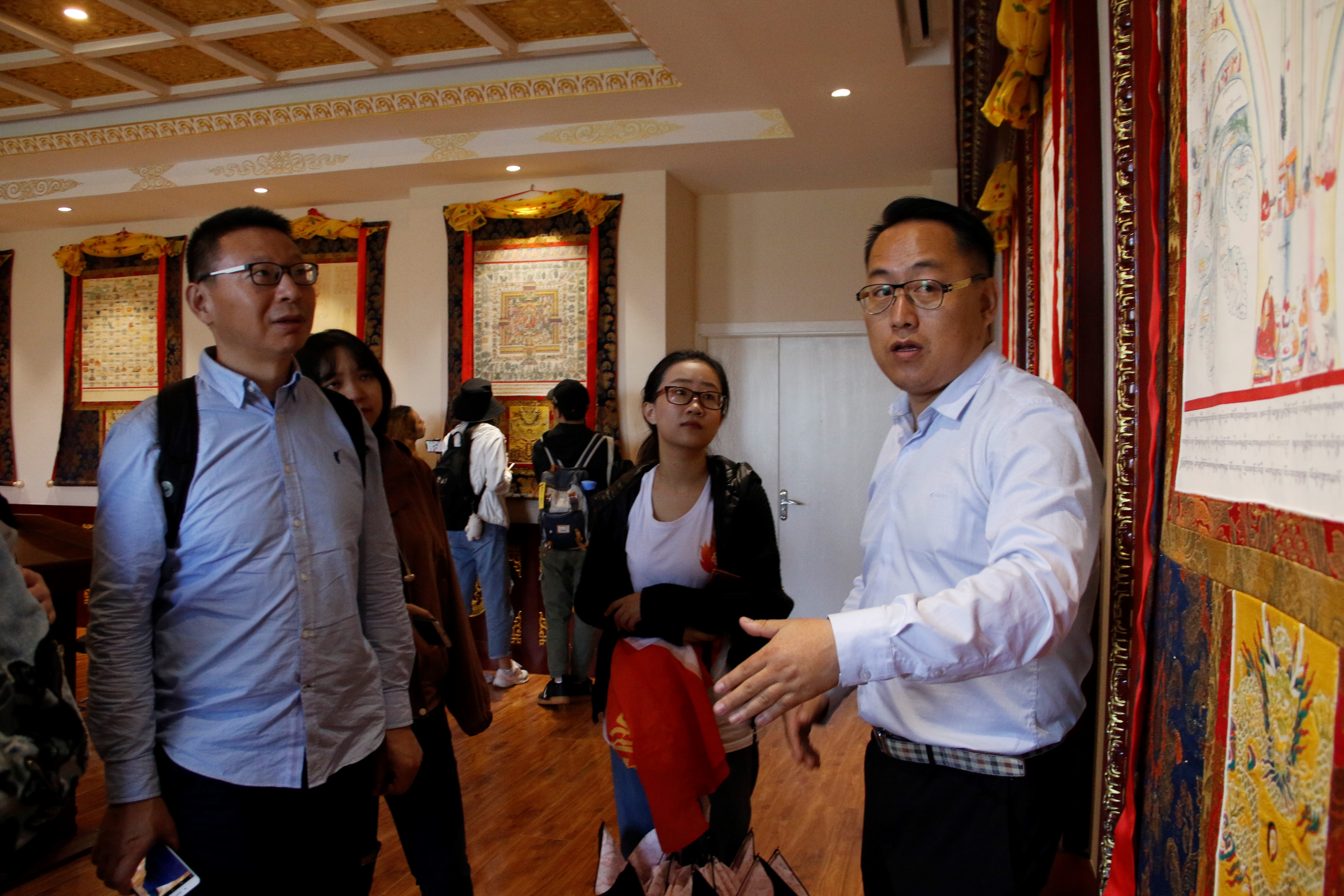藏医学院老师(右)介绍藏医唐卡教室