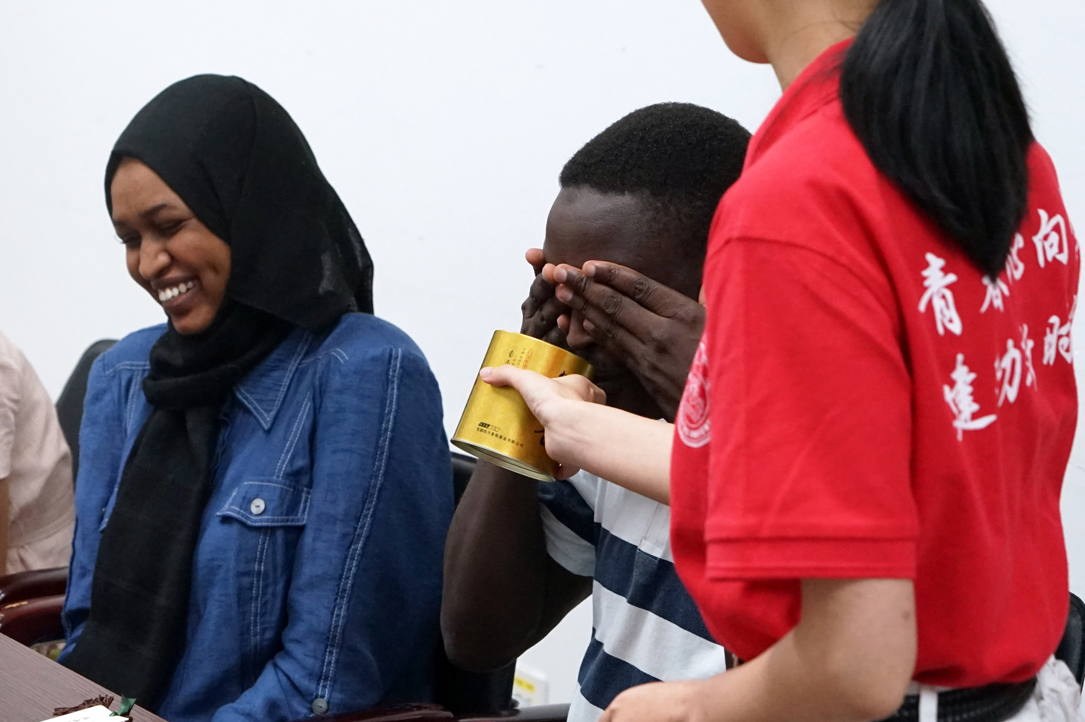 详细的理论讲解后,实践队员们手把手指导留学生们如何泡茶。大家纷纷选择了自己喜欢的茶叶,亲手沏茶、品茶。在茶叶的芳香中,留学生们亲自感受了中国茶道的魅力。课程结束后,是轻松有趣的游戏环节。留学生们通过香气来分辨不同种类的茶叶,现场欢声阵阵,气氛十分热烈。在最后,实践队员请留学生们挑选各自最喜欢的茶叶,并将茶叶赠予他们留作纪念。