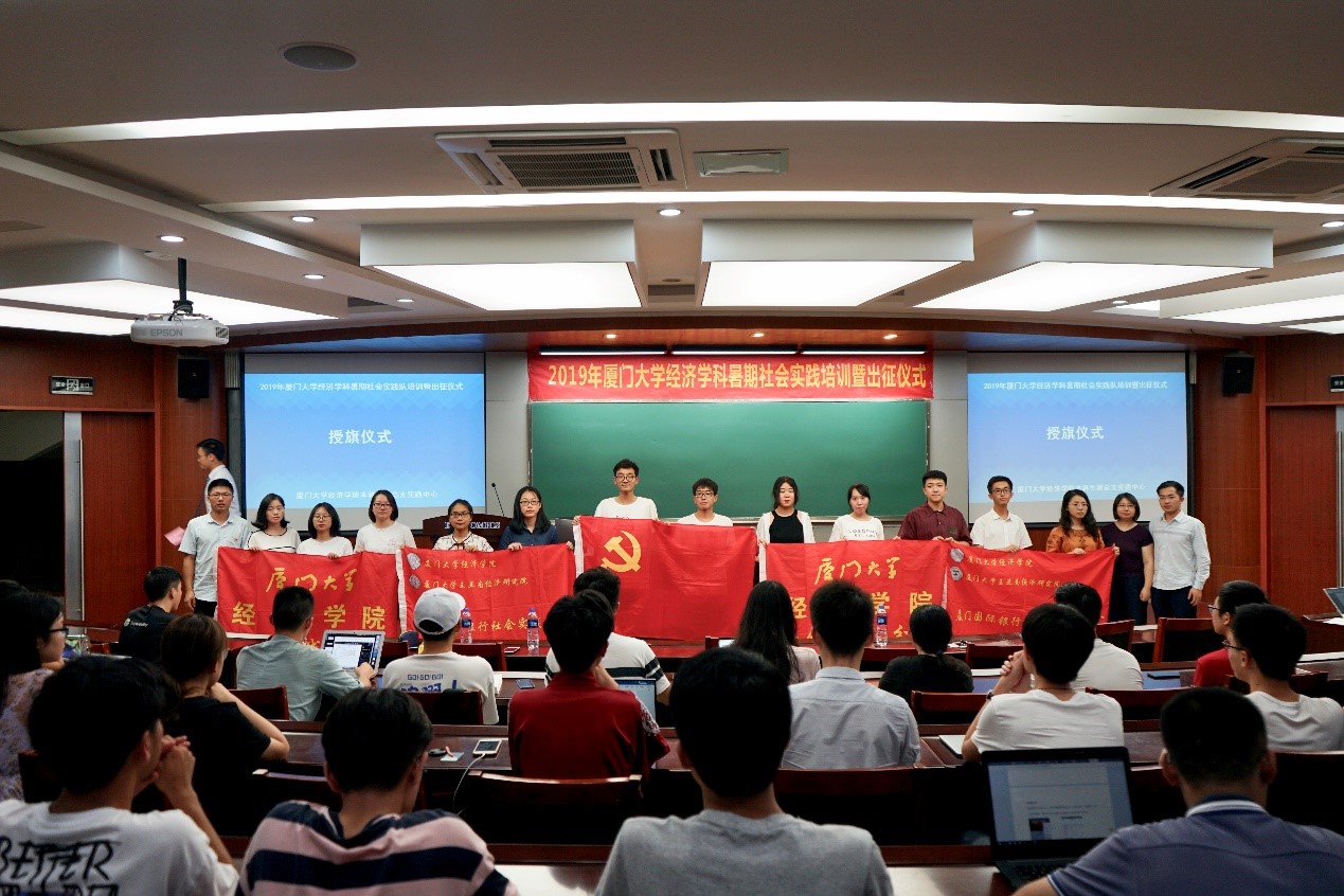 最后,学院老师为实践团队代表授旗,也将一份沉甸甸的责任交付于同学们。至此,厦门大学经济学院2019年暑期社会实践队培训暨出征仪式圆满结束。