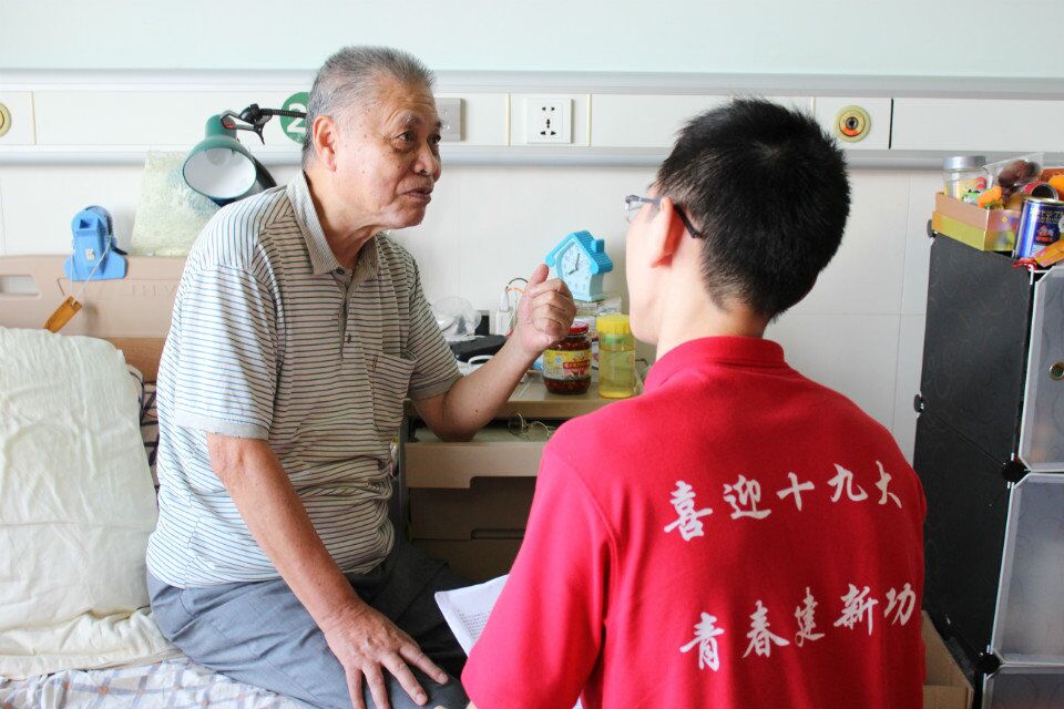 第一位采访者是住在医院的一位爷爷。爷爷的精神状态十分好,听闻队员们来,他十分高兴,立马将队员们迎入自己的房间。队员们和爷爷由日常话题开始聊起,队员们问了爷爷在这平常吃住如何,是否满意等小问题。在深入的攀谈之后,队员们才知道爷爷是和老伴一起在这儿住,不过,奶奶的情况不是特别好,现在基本处于植物人状态。乐观的爷爷还告诉队员们在这生活其实和家里并没有太大的区别。以前在家的时候请护工帮忙,两个人的退休工资勉强够生活。但是,搬到养老医院后,两个人每个月的工资还会有一点剩余。这种医疗与养老相结合的医院给老人们带来了福祉。
