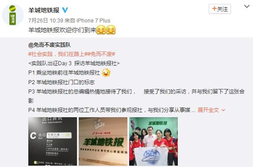 之后,羊城地铁报官博转发了实践队微博,表示欢迎我们的到来。