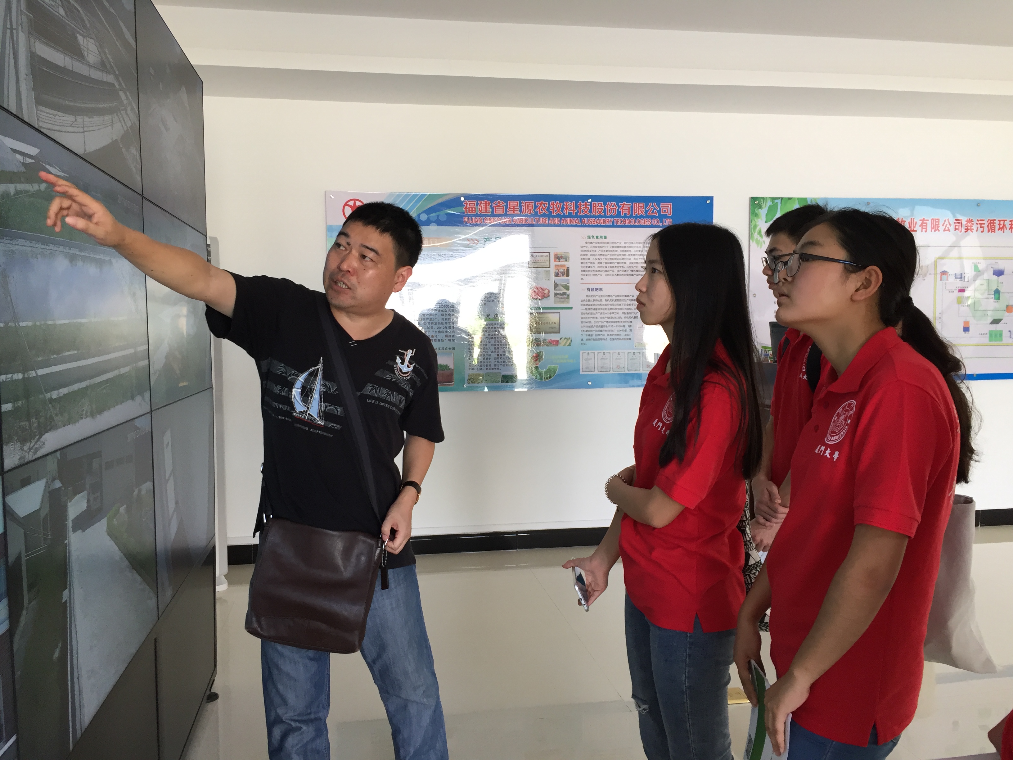 结束了在示范区的参观后,实践队员前往下一个目的地——福建省星源中德牧业有限公司。公司负责人播放了公司的介绍视频该公司现在主要从事生猪养殖及销售业务。公司采用“猪-沼-菜”粪污循环利用模式,实行科学饲养、优化品种、科学管理、实现流程化、程序化控制。