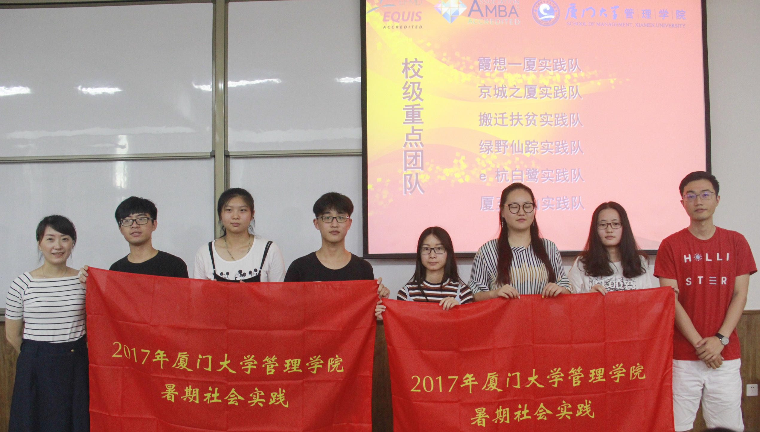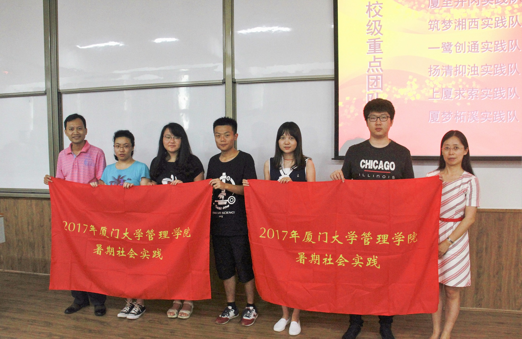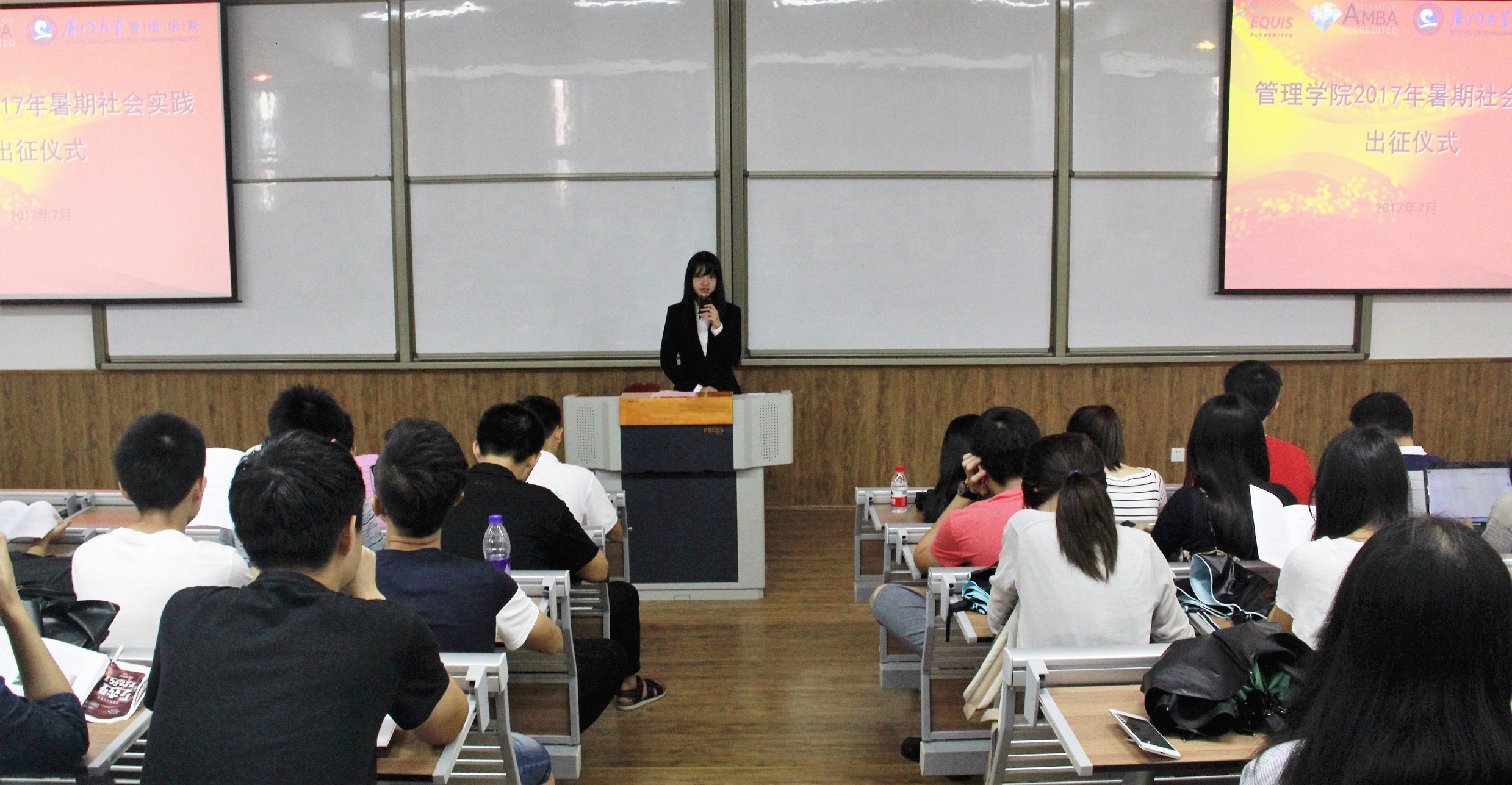 7月9日上午,管理学院2017年暑期社会实践出征仪式在南强二401正式举行,院党委副书记李峰,团委书记江娇,团委副书记周颖、吴光锡,辅导员揭上锋、刘晓宇,职业发展中心王韦惠出席出征仪式并为学院社会实践队伍授旗,仪式由2016级工商管理大类本科生杨欣桐主持。