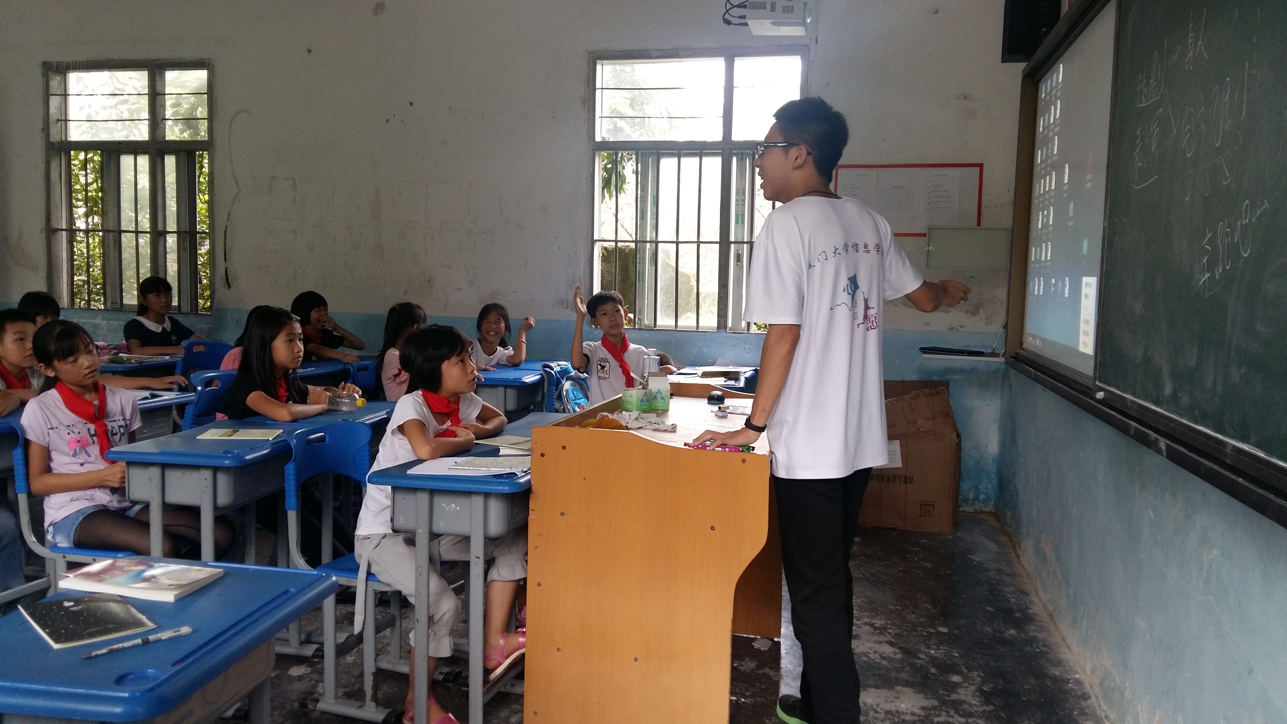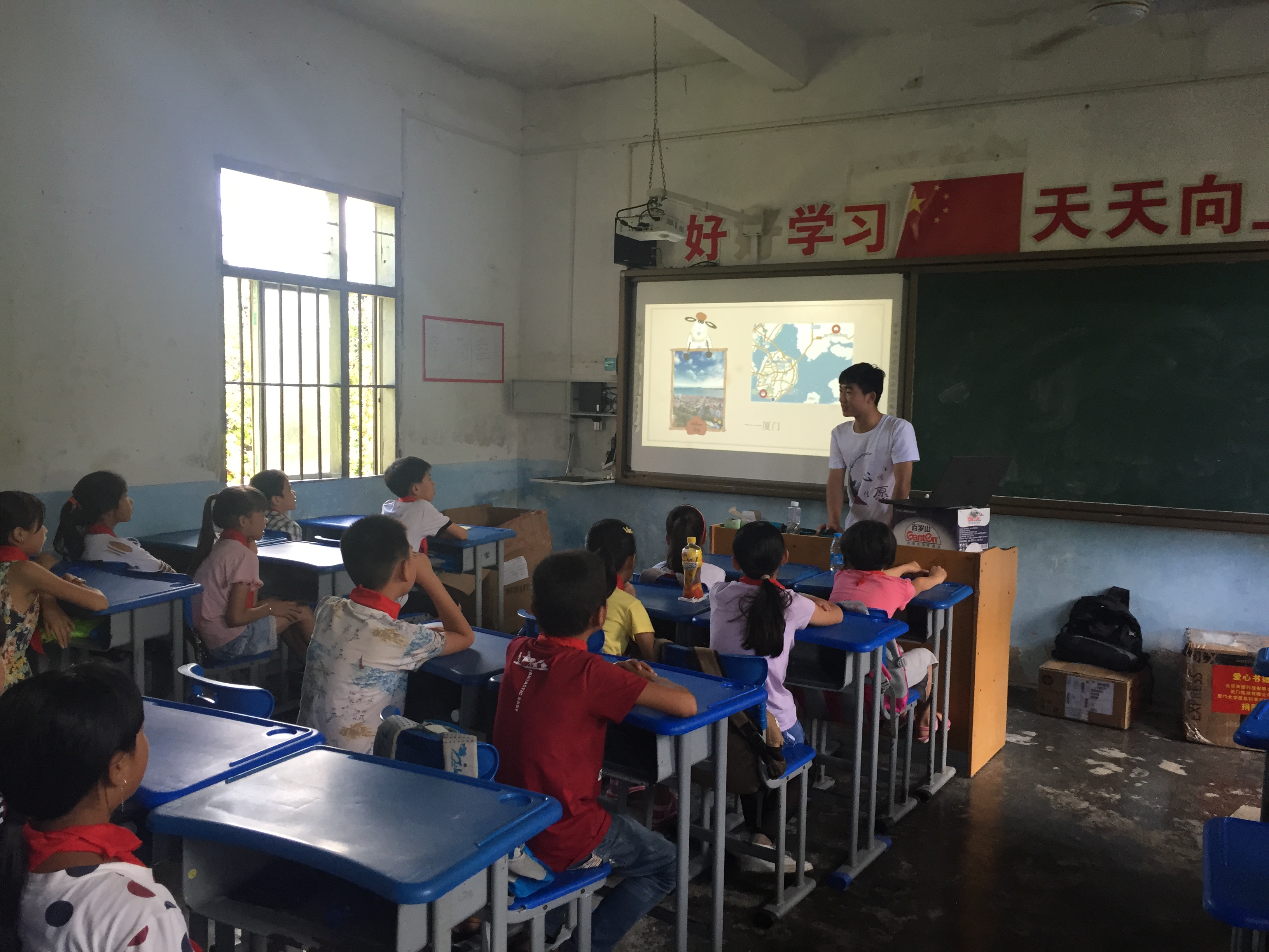 伴随着《凤凰花开的路口》的悠扬歌声,夏令营的课程正式拉开帷幕。“朱厝村的厦大气息”是夏令营的第一节课,也是拉近学生与队员之间关系的重要课程。队员们首先介绍了厦门大学的历史、校训,之后来自信息科学与技术学院、海洋学院、外文学院和人文学院的队员分别介绍了自己的学院和大学经历,引导孩子从小树立理想目标,有的孩子勇敢地表达出“我想去北京”,真挚的眼神中透着“我可以”的勇气。