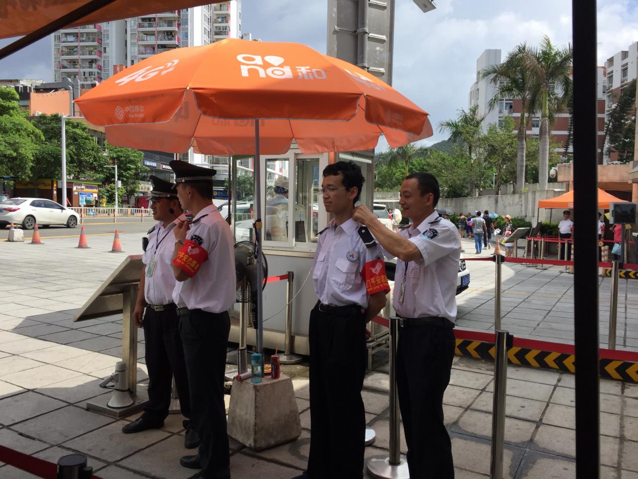 “安防小分队”的同学们来到了学校西村、大南校门门岗。他们不仅要刷验身份证,时刻注意有没有可疑人员,还协助维持校门口的秩序,检查进门的证件。厦门的夏天轻轻松松就攀上了35°的高温,身着制服的同学们早就湿透了衣衫,汗如雨下。同学们说:“以前进出校门被拦下检查证件,还总觉得保安多事,现在才体会到他们守护的是学校的安全呀!”