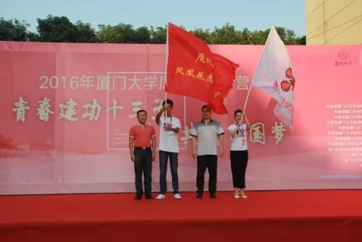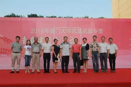 珩厝小学凤凰花夏令营开营仪式由带队老师刘慧主持。郭闻文副书记讲话并宣布2016年厦门大学凤凰花夏令营开营。林佳跃局长和高忠华副书记共同为凤凰花夏令营授旗。