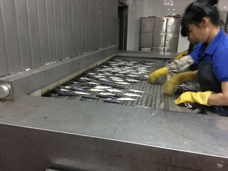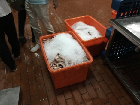 来到了公司后,公司负责人先简单介绍了公司概况,我们了解到公司主要业务为对外出口的水产加工,也有一小部分作为内销。从员工更衣室、消毒室穿过,我们随即到达生产车间里,在不同的车间里,进行着不同的加工工序。冷冻的水产从冷库里被分批运进车间里,据介绍,因为目前处于国家规定的休渔期,所以冷库中库存并不多,工作量也相对较少。