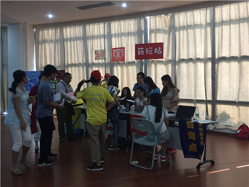 药学院迎新点今年的重点放在海报上,注册点旁的家长见面会的宣传海报与药学院的吉祥物“小药丸”、“小黄人”相映成趣,十分醒目。而取“药丸站”谐音的“药玩站”标牌也遍布在药学院的各处迎新点,如注册点、行李点和家长休息点等,霎时一道好风景。
