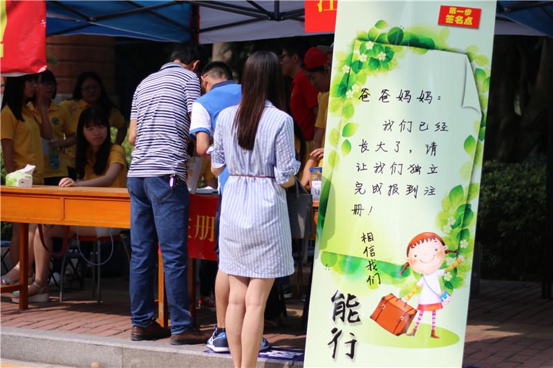 大学是新的起点,也是大部分同学独立生活的起始,管理学院注册点旁的展板上也写道:“爸爸妈妈,我们已经长大了,请让我们独立完成报道注册。”在迎新的过程中,有不少独立完成所有手续的新生,软件学院的洪同学就是自己一个人来报道的,“爸妈还在工作,住得也不远,就在福建省内,就自己过来了。”刚开学的生活总是忙碌的,要报到注册、整理宿舍、安排之后的生活。也有一批新生不只是在为自己而忙碌,来自安徽的小白同学是新闻传播学院的2015级临时负责人之一,虽然也是新生,但她也要在注册点帮忙、为新同学整理分发军训服、带新生了解情况和为新生提供信息,这并不是一件轻松的工作,“昨天累得晚上腿都抽筋了,因为浑身酸痛晚上还失眠了。”但是能得到锻炼的机会她也感到很值得,“可以超前了解大家,超前有更多经验,超前获取信息,超前获得在大学努力的幸福感。”