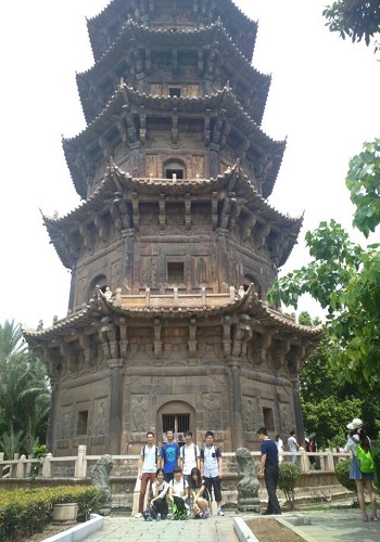 炎炎夏日,实践队九人抵达泉州,便立即赴开元寺进行实地考察。通过调查访问发现,开元寺整体建筑保存的非常完整,充满着浓郁的历史人文气息,唐朝盛世从中依稀可见。据寺内人员介绍,开元寺自建立后,各个朝代都有作修缮,目前大约三十年会翻新一次,虽开放游客参观,但并无大碍。调查途中,队员们发现,开元寺最有名的东西双塔现在已经不开放游览,据了解主要原因是为了游客的安全,同时也对文物有一定的保护。双塔历经千年风雨侵袭,仍屹然挺立,勃发出雄宏的气势,可见其高超的建筑技巧。