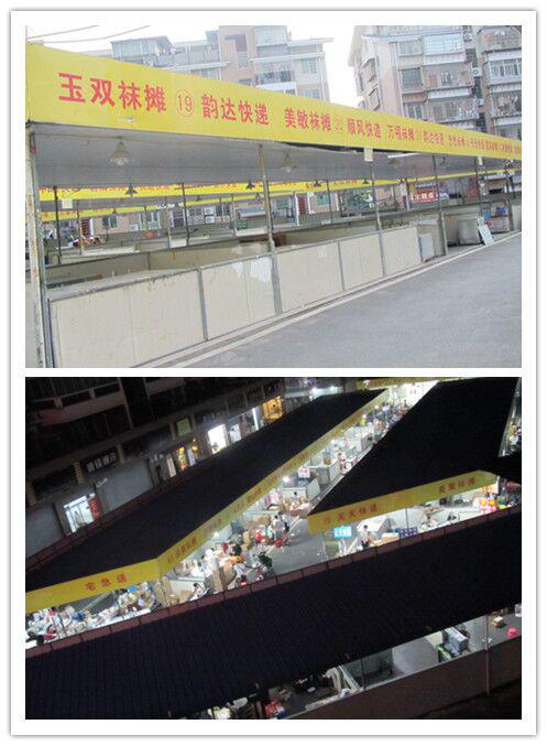 27号下午初到这里,映入眼帘的是一栋尚在建设的大楼,大楼之上几个大字牌匾被红布遮着,依稀可以看到是“安福电商城”。而一街之隔便是曾经的安福小区,即现在的安福电商城二期,依然保留着原来的街道规划,却增加了一些如宣传栏、警务室等公共基础设施。道路两旁的店铺仍有一些挂着出口贸易的大招牌,大多情况下一条街只有一两家店铺拉开了自己的卷帘门,可是店员却悠闲地坐在柜台后埋头做着自己的事,队员们试探着装成顾客模样进店选购,然而里面的店员也只是抬眼看看,态度冷淡。当然更多的店铺是大门紧闭。在安福小区后围,有一大片搭起的棚子,每个棚子下面是大型铁皮箱做成的台子,却空空如也不见半个人影。而棚子的招牌也十分奇怪,隔成两半,一半写着某某袜摊,一半则挂着不同物流公司的名字。棚子区的旁边,便是大型的宣传栏,栏里陈列着一些政府扶持自主品牌创立的政策,墙上也挂着一个大型灯牌,展示着莆田市政府重点孵化的鞋业品牌,思威琪、西域骆驼等都属其中。傍晚时分,队员们在路上偶遇了三四个聚在一起的大妈,她们带着本地口音热情地招呼我们,“做鞋吗?搞不搞批发?”