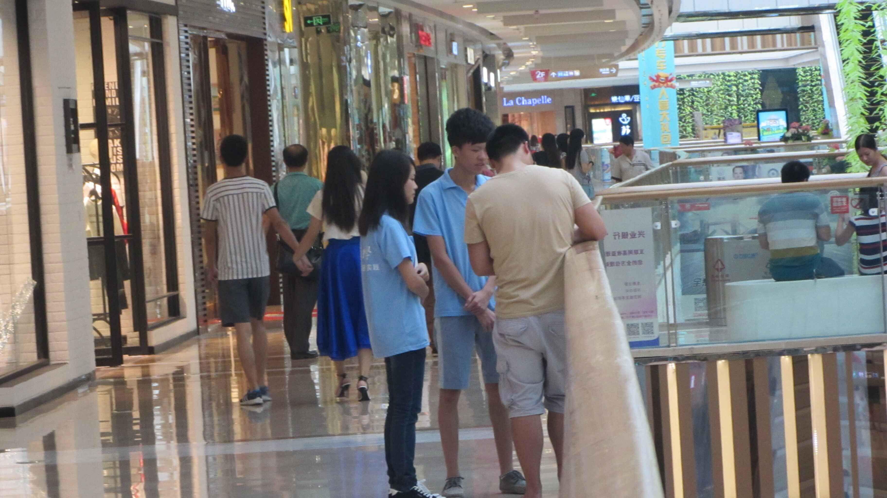 没有上海、北京的快节奏生活模式,莆田这座城市在早上九、十点渐渐苏醒,街头人们行色匆匆,街边随意坐着乘凉的大爷大妈,平静是这个城市给队员们的第一印象,曾经处于漩涡中心、备受媒体聚焦的影子似乎已无处可寻。实践队员走访的第一站是莆田万达商业广场,位于小城市中心,四周是各式各样的商业住宅楼,职业装的白领、周末购物的大家庭、年轻的消费团体是样本采集的重点人群。队员们分成两个组别——采访组、问卷组,分散到不同楼层,开始着各自的工作。