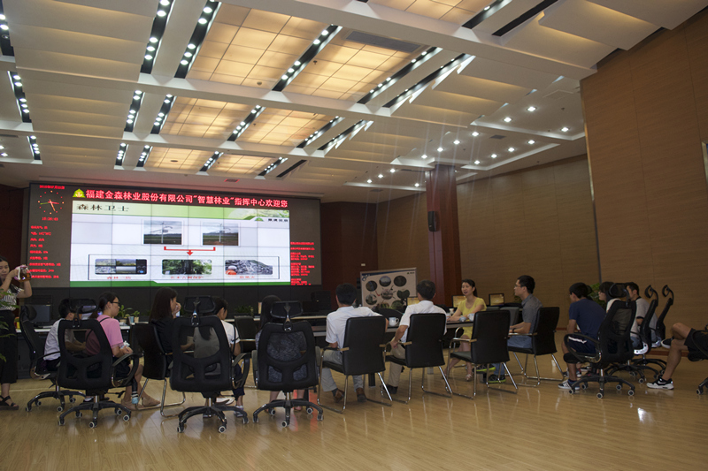 实践队于下午三点正式开始调研活动。在将乐县副县长余志伟同志的陪同下,实践队第一站来到了福建金森林业股份有限公司。在公司的指挥中心,实践队队员听取了工作人员的详细介绍,了解了金森林业的发展过程和现状。该公司始创于上世纪50年代,是一家国有林业企业,主营林木、花卉管理销售等项目。2012年以来,在云计算、物联网、移动互联、大数据等新一代信息技术的推动下,公司通过“智慧林业”建设,形成了信息基础条件国际领先、生态管理与民生服务质量明显提高、林业产业结构与创新能力优化发展的模式,重塑了林业系统管理机制,实现了现代林业的发展目标。