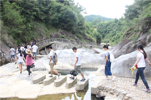 到达芹溪村后,古田县秀丽的山水风光又一次让实践队员们叹为观止。在村庄负责人的带领下,队员们沿着一条山田间小路前行,穿过一小片绿得醉人的水稻田,便踏上了通往峡谷的石子路。一条清浅小溪蜿蜒入山,队员们低头当心着脚下的浅滩,抬头欣赏着重峦叠嶂的美景。走到尽头,清新的山间空气一扫队员们前两天的周居劳顿,大家在那里留下了青春笑脸的纪念。