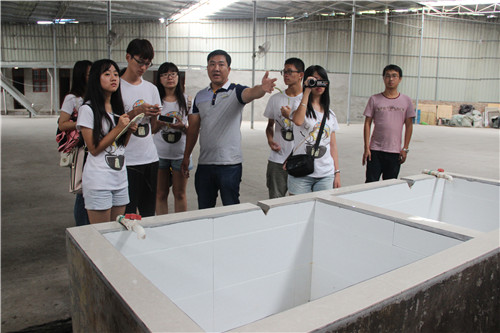 接着,实践队来到了万邦食用菌有限公司。该公司位于古田县吉巷乡渭洋村,主要经营三类项目:一是生产种植银耳用的菌袋,二是租赁培育银耳的菌棚给农户,三是进行银耳的采摘、加工与销售。实践队员们在工厂负责人的带领下参观了用于加工白木耳的厂房与用于种植的菌棚。由于现在正处盛夏,队员们遗憾没能看到菌棚里千万朵银耳花盛开的壮观景象,但是在负责人的讲解下,大家还是详细地了解到了银耳的整个生产流程。在采摘加工银耳的厂房内,银耳的采摘全部由机器进行,采摘好的银耳由机器分批次运输到水池中浸泡清洗,随后被整齐码在竹排子上置于65至70摄氏度的烘干箱中进行脱水。值得一提的是,提供烘干温度的锅炉燃料是回收来的废菌袋,又称“木耳棒”,这样的生产方式及其高效环保。烘干好的银耳便可以进行销售了。交易银耳的批发商一般都是亲自来当地挑选银耳再购入,多年来,万邦公司已与诸多批发商建立了长期合作关系,让村民们发家致富。随后,实践队跟随负责人的脚步来到了制作种植银耳所用菌袋的加工厂房。菌袋相当于是银耳的培养基,由万邦公司统一生产,以便利用先进的机器严格保证杀菌的质量和生产的效率,更加有利于银耳培育,这是古田的银耳产量位于全国乃至世界前列的原因之一。全国95%的银耳都来自古田,并且远销东南亚多国。最后,队员们来到了培育白木耳的菌棚。据介绍,一个木耳棒上可以生长三朵白木耳,而一个菌棚里可以容纳约4000个木耳棒,规范化的生产使得产量十分可观。白木耳从种植到成熟需要40到50天,一年中以2月和9月为生长旺季。队员们还就自己的疑惑向讲解员仔细询问,并认真记录,以便后期撰写调研报告时所用。