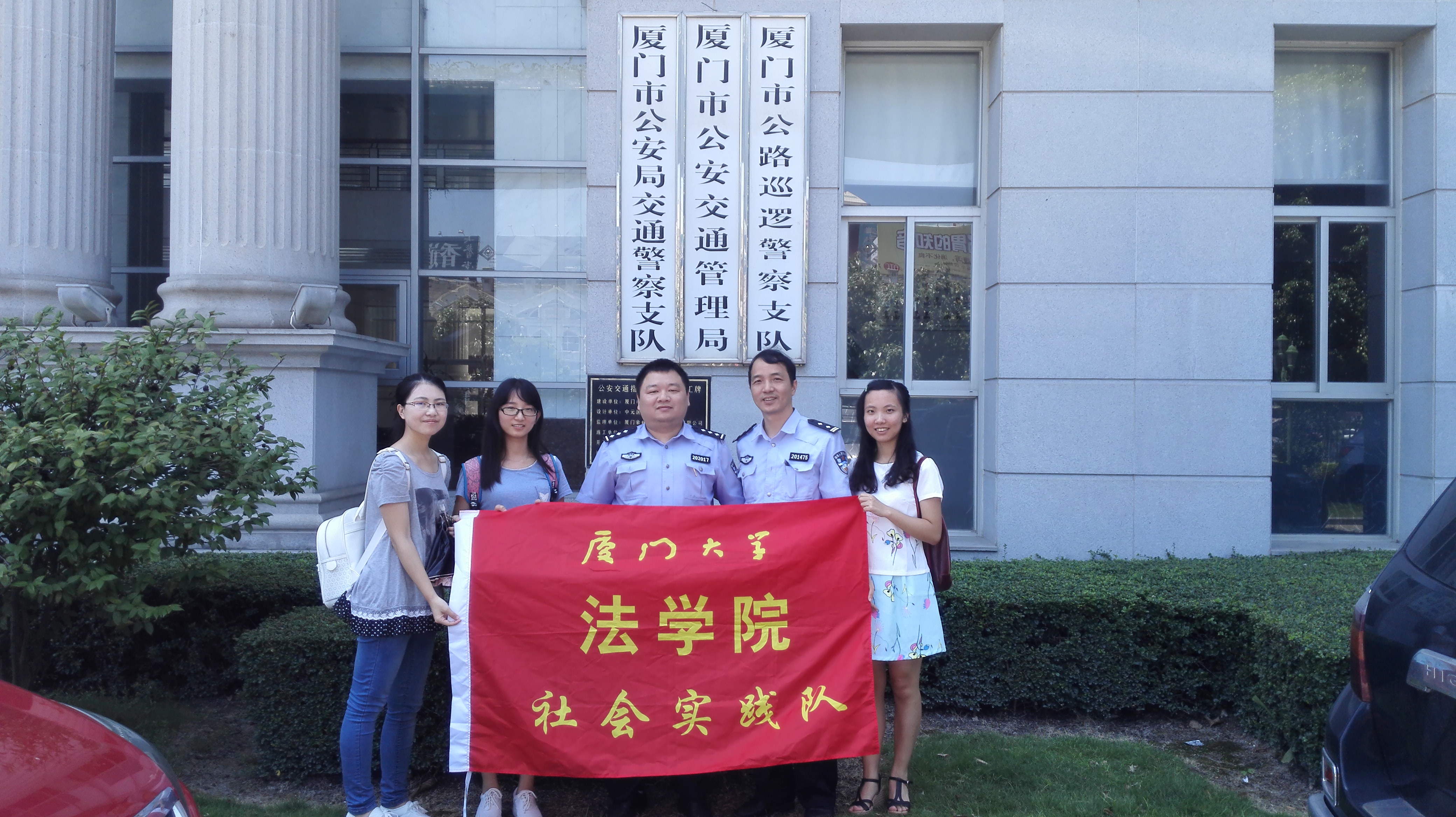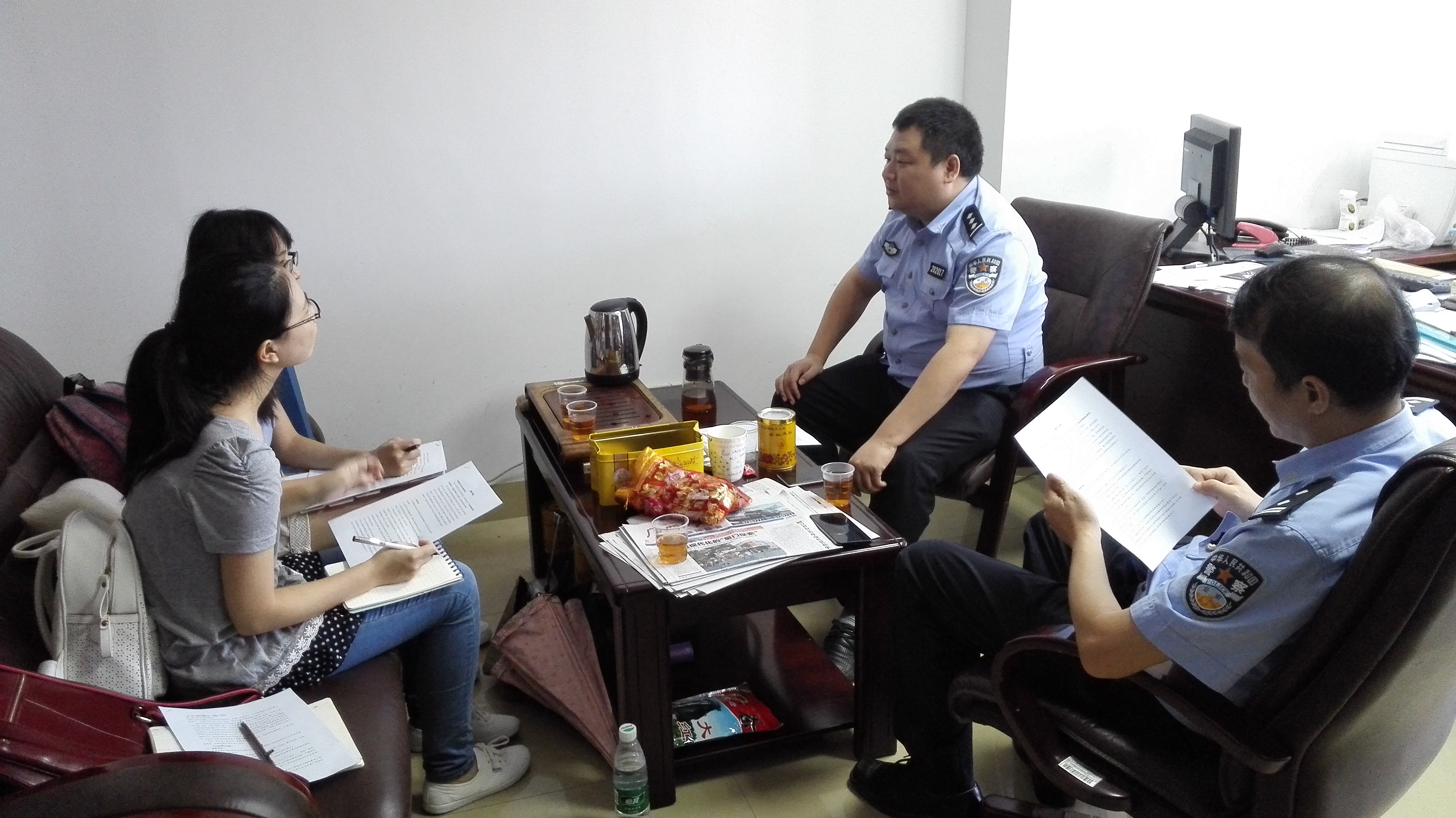 2015年7月28日上午,“不安全驾驶实证研究”实践队一行人来到厦门市公安交通管理局,交通法制处的陈继洪警官和交通安全管理处的陈海龙警官热情地接待了实践队成员,在访谈中,实践队向两位警官询问了关于危险驾驶涉及的种类,各类道路交通违法行为的年度数据,醉驾的判定标准,醉驾的处理方式等问题,两位警官都对此进行了耐心的讲解,并谈及在实务工作中出现的亟待法律法规完善才能解决的难点问题和公众对于危险驾驶犯罪的常见误区。