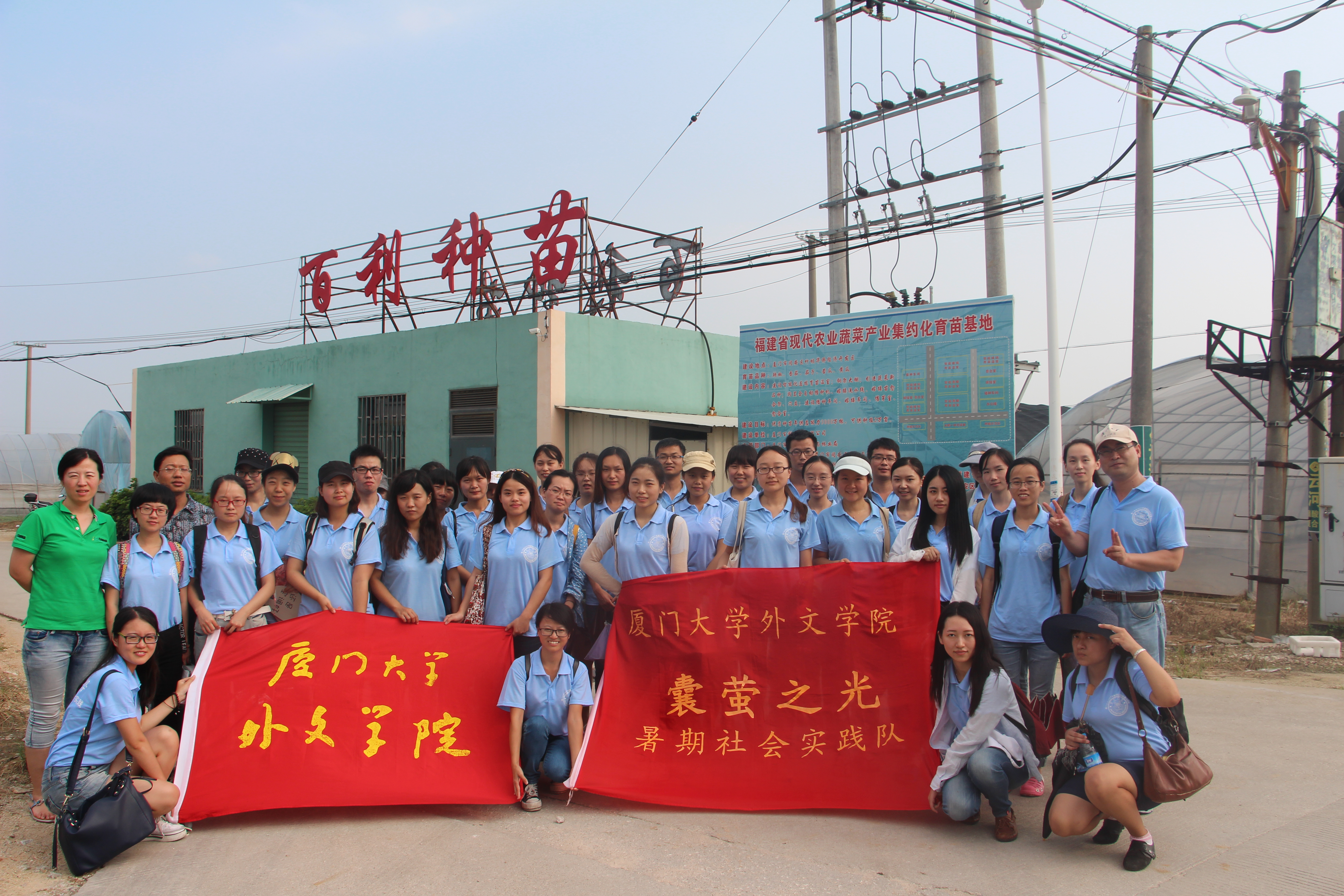 农业是国民经济的基础部门。2015年全国两会政府工作报告中提到,要增强农业综合生产能力,推进农业现代化。受此激励,7月27日下午,厦门大学外文学院研究生“囊萤之光”暑期社会实践队全体成员从竹坝学校出发,由竹坝学校副校长吴志荣老师,外文学院团委书记、研究生辅导员乐无恙老师,研究生兼职辅导员李宝龙老师带领,前往同安国家农业科技园区参观厦门百利种苗有限公司,学习了解现代农业的生产经营模式。