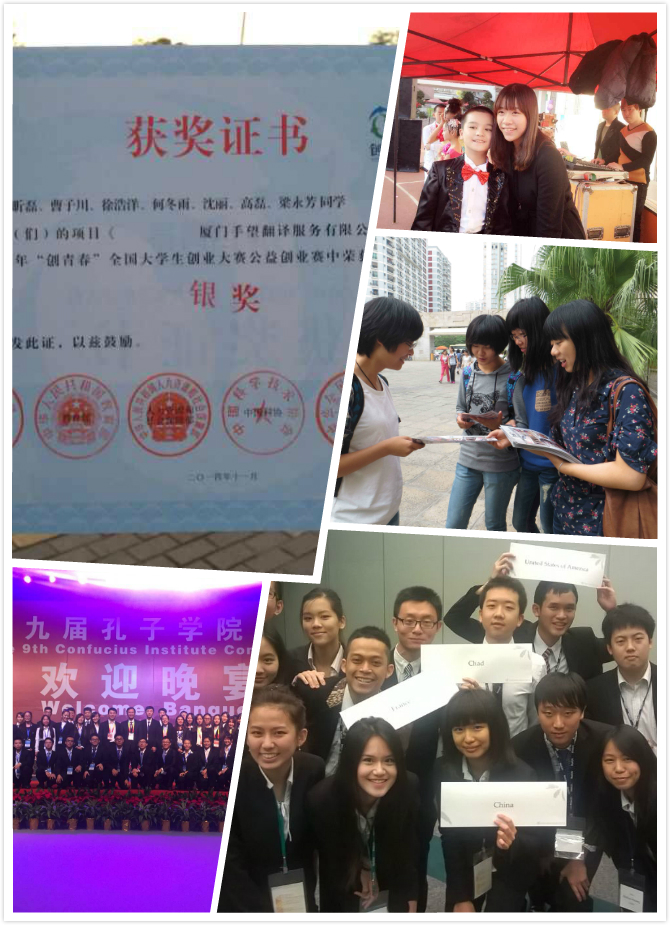 高昕同学是英四支部里的创业典范。大一时无意间接触的手语,现在却成为了她为之奉献的“事业”。在手语的学习中,她不仅看到了聋人对与正常人交流的渴望,更看到了当前社会对于手语翻译人才的迫切需求。“这可能是一条沟,需要有人去填补。”随后,她便以手语为切入点,开始了漫长的为聋人朋友寻求服务的征程。在克服了寻找投资公司、搭建网络平台的困难后,她最终收获了果实。2014年,以高昕为队长的 “厦门手望翻译服务有限公司” 创业项目在2014年“创青春”全国大学生创业大赛公益创业赛中获得了全国银奖。
