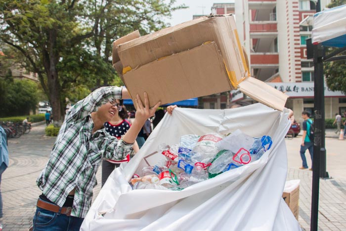 此次活动要求学生用足够数量的饮料瓶来换取绿色盆栽,含羞草对饮料瓶数量要求最少只需要75个,其余盆栽都是100个或以上。虽然对饮料瓶数量要求较多,但活动现场依然人数爆满,不断有学生提着大袋的饮料瓶来换取盆栽。在废瓶的搬运方面,协会负责人表示他们为这次活动专门招募了一些志愿者,其中很重要的一份工作就是帮学生搬运饮料瓶。针对有些同学说的可换的废品种类少的问题,绿野协会负责人表示他们也办过一些别的回收交换(包括旧书废纸),但是他认为旧书废纸都可以再次利用,它们不适合用来交换。