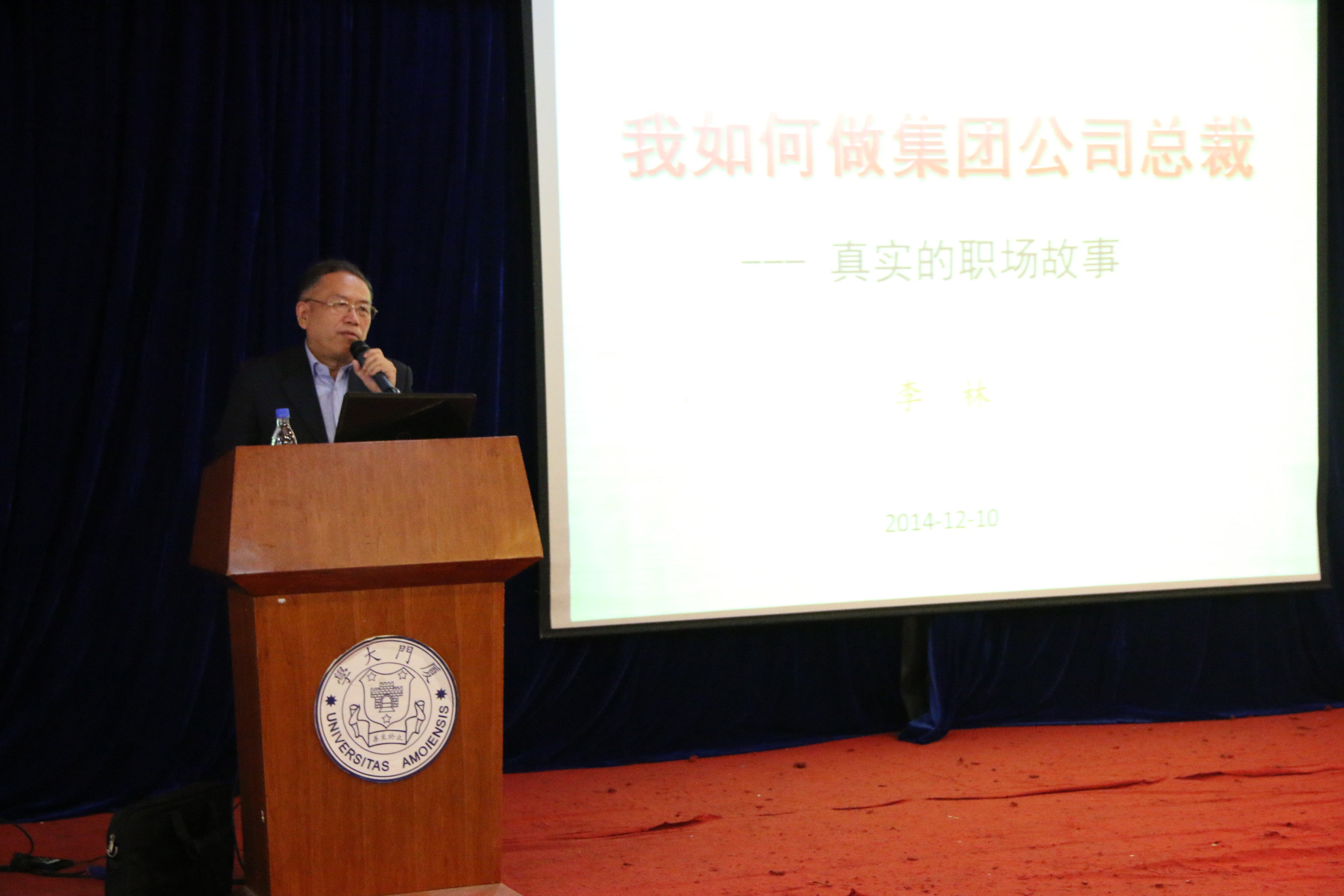 2014年12月10日晚,海奥集团公司总裁李林先生在自钦楼多功能厅与厦大学子分享了他多年的职场经验,带来了题为《我如何做集团公司总裁——真实的职场故事》的讲座。出席本次讲座的有海奥集团董事长郑金泉先生,默邦公司总经理申莉女士,厦门电视台专题部主任郑大希先生,厦门大学出版社社长蒋东明老师,厦门大学校发展规划办公室副主任杨旸老师和厦门大学校团委副书记廖晓波老师。