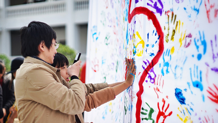 现场丰富多彩、形式新颖的活动以及独具特色的活动纪念logo吸引了广大同学们的参与。“彩色手印”背景墙上,一个由五颜六色的手印组成的中国志愿者标志逐渐成形。现场的同学们争相在背景墙上留下自己的手印,手掌沾上颜料的同时心头也染上了欢愉。来自药学院的王晓楠同学谈到志愿活动时表示,虽然平时学业比较繁重,但有空时总会积极参加一些志愿活动,如药品知识宣传之类。她觉得能够宣传这些人们不太熟悉而又比较重要的知识是非常有意义的。阳光下,背景墙上的手印相互交错,正像大家手拉着手,一起为推动志愿事业而努力奋斗着。“志愿祝福”活动的帐篷外不知何时挂上了一幅随风舞动的祝福帘,一张张明信片上写满了同学们的希望与祝福,表现了同学们对志愿文化的传承。可爱的“易班熊”穿梭于整个广场,同学们与可爱的卡通形象深情相拥,每一个拥抱都充盈着爱与温暖,而独具特色的合影接力,也必将给同学们留下难忘的记忆。“绿丝带”活动中,别在胸前的绿丝带如青鸟的羽毛一般在校园中跃动。公共卫生学院的陈凌眉同学刚刚将自己的绿丝带传递给了他人,说起参加志愿活动的初衷,她觉得,作为当代青年,我们掌握了科学知识,但与此同时,也要寻求自身价值的实现,培养高尚的品质。同时,作为公卫青协的一员,她也指出了当前同学参加志愿活动的一些不足——有少部分志愿者只是为了获得工时而参与志愿活动,过程中难免出现敷衍了事的情况,她觉得志愿活动既能够帮助到他人,又能在期间提高自身能力,认识许多志趣相投的人,是非常有意义的事情,同学们应该带着一颗真心去参加、付出,也希望志愿精神能够传播地更远。