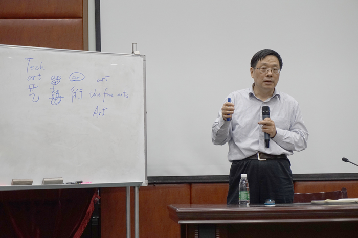 在讲述艺术(文学)与技术的关系时,高教授先从“艺术”与“技术”的希腊语词根上讲述了艺术与技术的同源性,并提出很多人心中的疑问,“艺术到底是不是技术?”高教授引用中国古代庖丁解牛的典故说道:“技术达到了一定高度,近乎于道,也就是近乎于艺术。”但高教授却立刻强调了艺术绝不同于技术。高教授认为艺术与技术的距离不是尺子测量的空间距离,而是跨越了不同维度的差距。