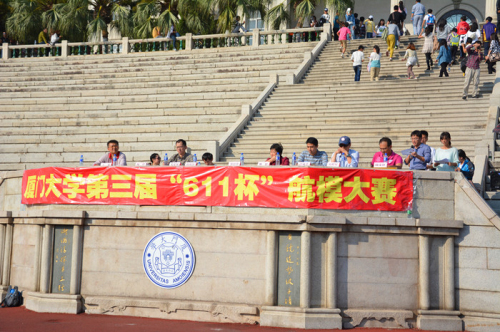 活动首先是校团委书记陈怀峰老师致开幕辞,致辞结束后是精彩的飞行表演,来自厦门大学无人机实验室的六旋翼飞行器为本次比赛带来祝福,接着翩翩飞舞的纸飞机和灵活机动的特技机342为大家展现了飞行的精彩,并拉开了本届“611”杯航模大赛的序幕。活动分为三部分,首先是非专业组纸飞机大赛,参赛选手大部分是对航模有爱好但了解不多的同学。参赛选手自己设计纸飞机,然后在工作人员的指导下安装动力系统,使得纸飞机可以飞行得更远。在主持人说开始之后,参赛选手全部用力掷出自己的飞机,在动力系统的带动下,纸飞机一个个飞向远方。