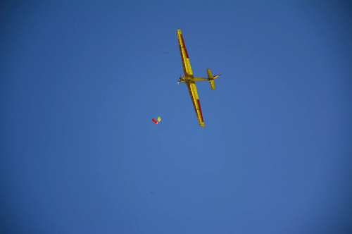 最激动人心的是最后出场的限时载运空投机,这架飞机和它的团队曾在今年的CADC2014科研类全国航空航天模型锦标赛中获得团体第4名的好成绩。这架航模的与众不同之处在于它的空机重量只有3公斤,却可以最大负重15公斤并在飞行时完成定点空投的任务。在操纵手的控制下,飞机顺利升空并在空中来回盘旋,随着队员的大喊“申请空投”,飞机在指定位置投掷下水袋,水袋在地面炸裂的同时飞机也安然返回地面。