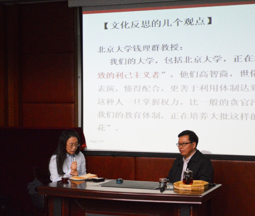 人文学院副院长李晓红老师与贺祖斌先生就提及的“乡贤”话题进行了简单讨论,他们引用了费孝通学者的观点——今日已无乡贤,发展中最大的问题是把乡村的精英抽到都市里去了。