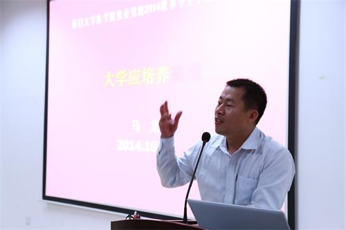 伴随着青春洋溢的共青团团歌,活动正式拉开帷幕。马龙老师首先作了题为“大学应培养高尚”的学生骨干培训讲座。他以一个“相亲”的小游戏迅速调动起全场所有同学的积极性,随后,他以“一张请柬”和“一份word文件”为例,详细讲述了学生工作中应养成“礼貌、认真、细致、准确、简明、及时”的好习惯,提出大学生应在有限的生命时间内培养高尚的情操。培训最后,他又通过“行军蚁”和“香山红叶”的例子号召大家要有牺牲个体、成全集体的大我精神,并要求大家对自己的现状和未来进行思考,学会辩证地看待问题。一个多小时的讲座,马龙老师声情并茂,以幽默诙谐的方式从多方面给大家进行了一次心灵的洗礼,整个讲座中掌声不断,同学们纷纷表示受益匪浅。